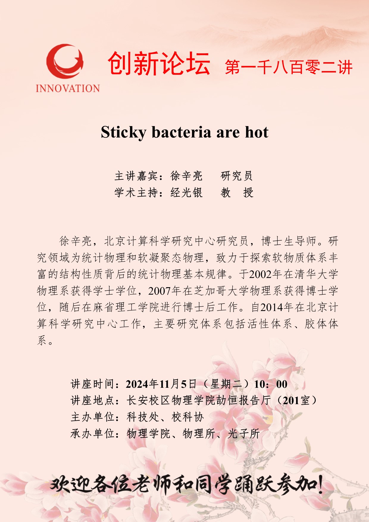 徐辛亮 研究员 8868体育登录创新论坛第一千八百零二讲:Sticky bacteria are hot 讲座时间 2024年11月5日(星期二)10:00 讲座地点 长安校区物理学院劼恒报告厅(201室) 讲座人介绍 徐辛亮 研究员 讲座内容