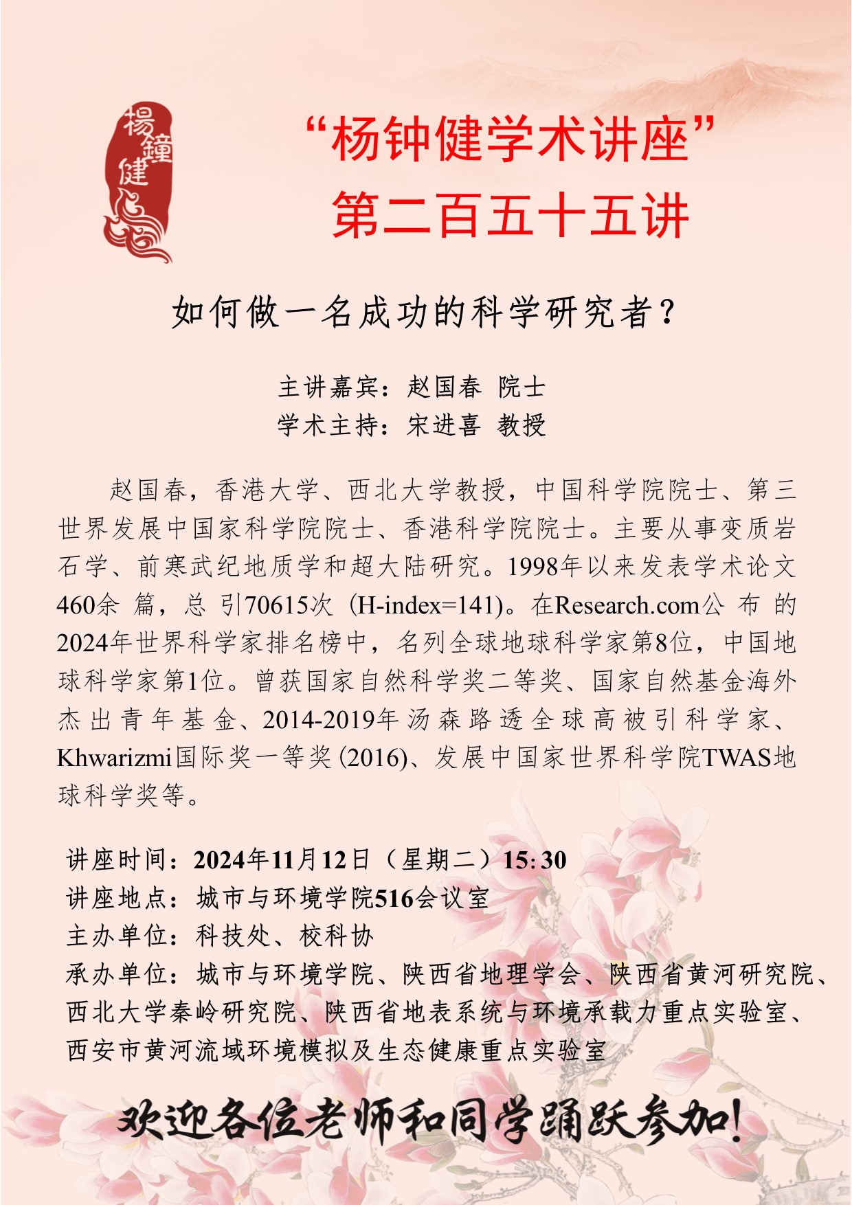 “杨钟健学术讲座”第二百五十五讲:如何做一名成功的科学研究者?