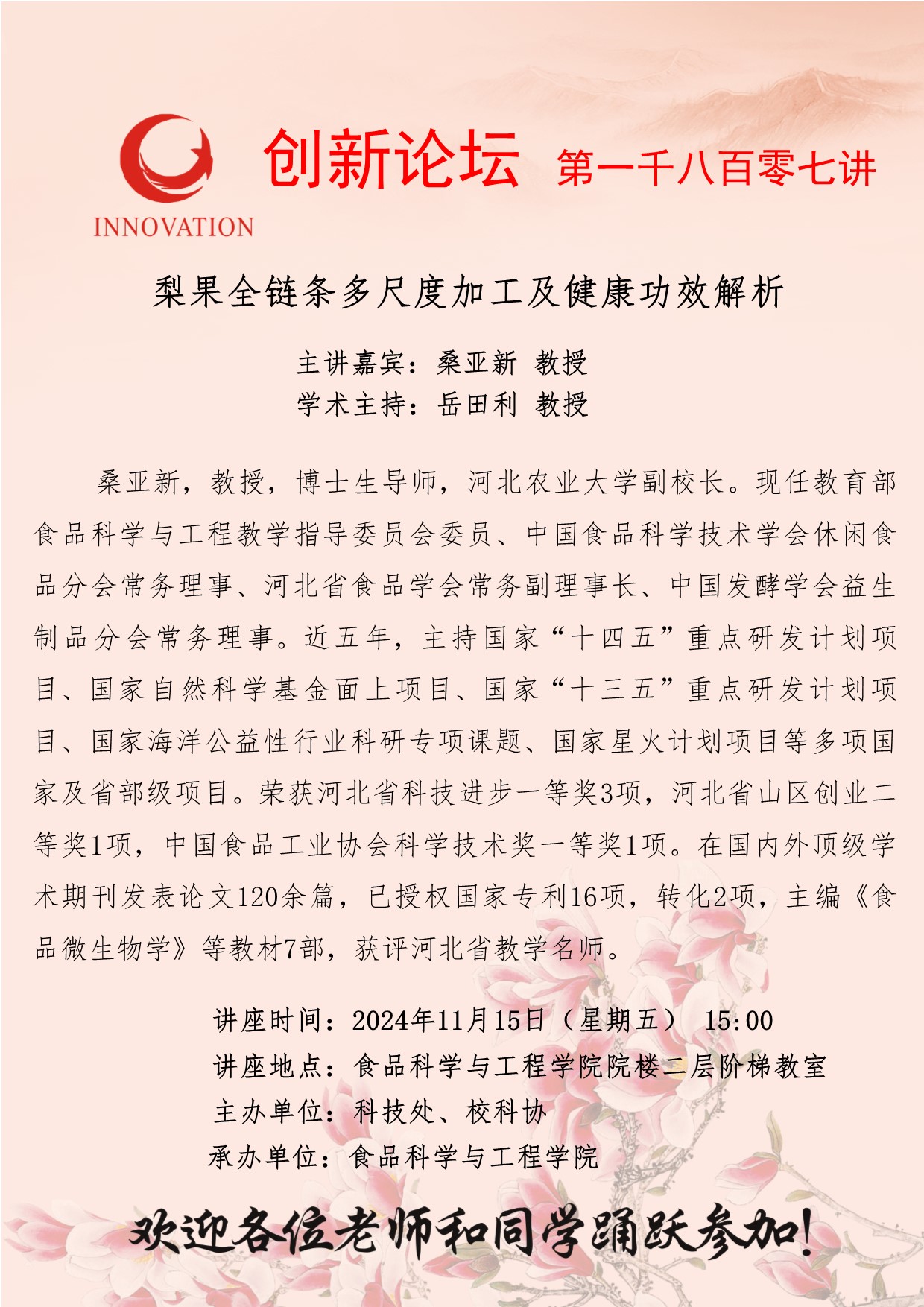 桑亚新 教授 8868体育登录创新论坛第一千八百零七讲: 梨果全链条多尺度加工及健康功效解析 讲座时间 2024年11月15日(星期五) 15:00 讲座地点 食品科学与工程学院院楼二层阶梯教室 讲座人介绍 桑亚新 教授 讲座内容