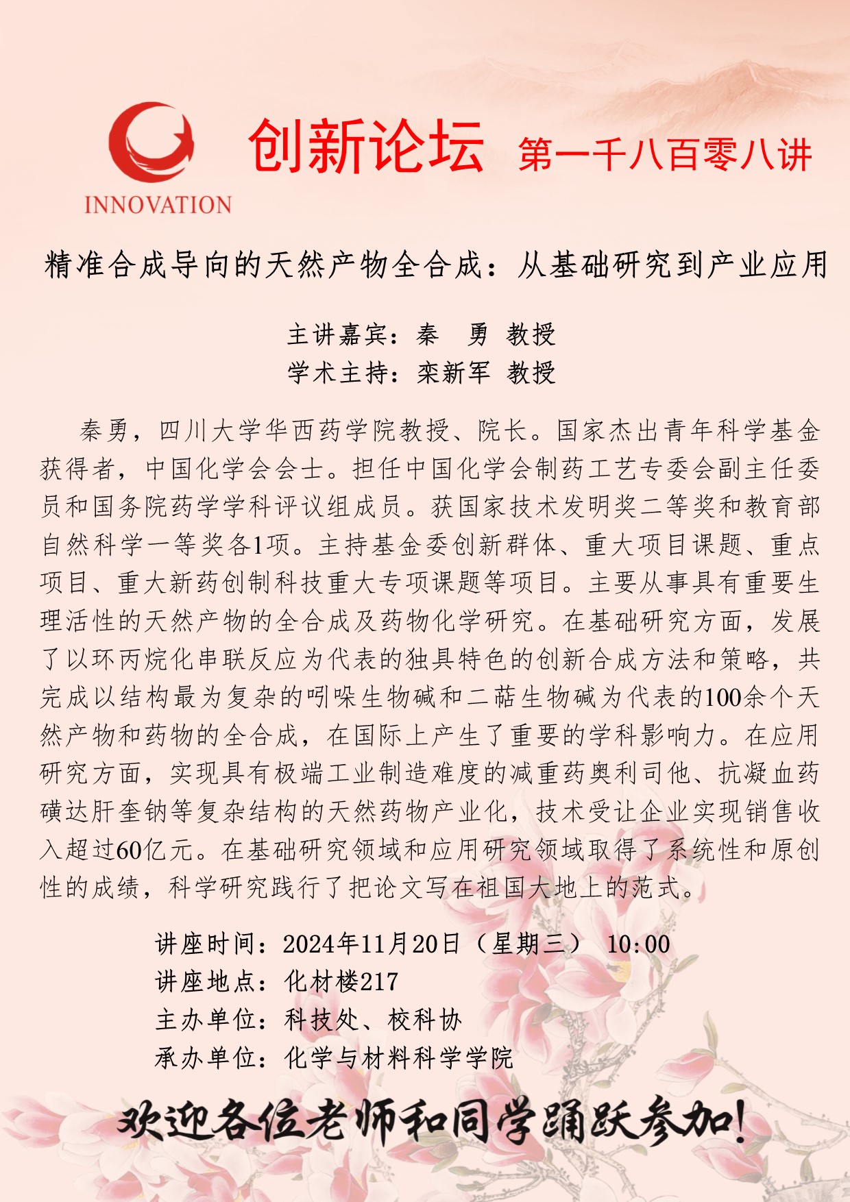 秦勇 教授 8868体育登录创新论坛第一千八百零八讲:精准合成导向的天然产物全合成:从基础研究到产业应用 讲座时间 2024年11月20日(星期三) 10:00 讲座地点 化材楼217 讲座人介绍 秦勇 教授 讲座内容