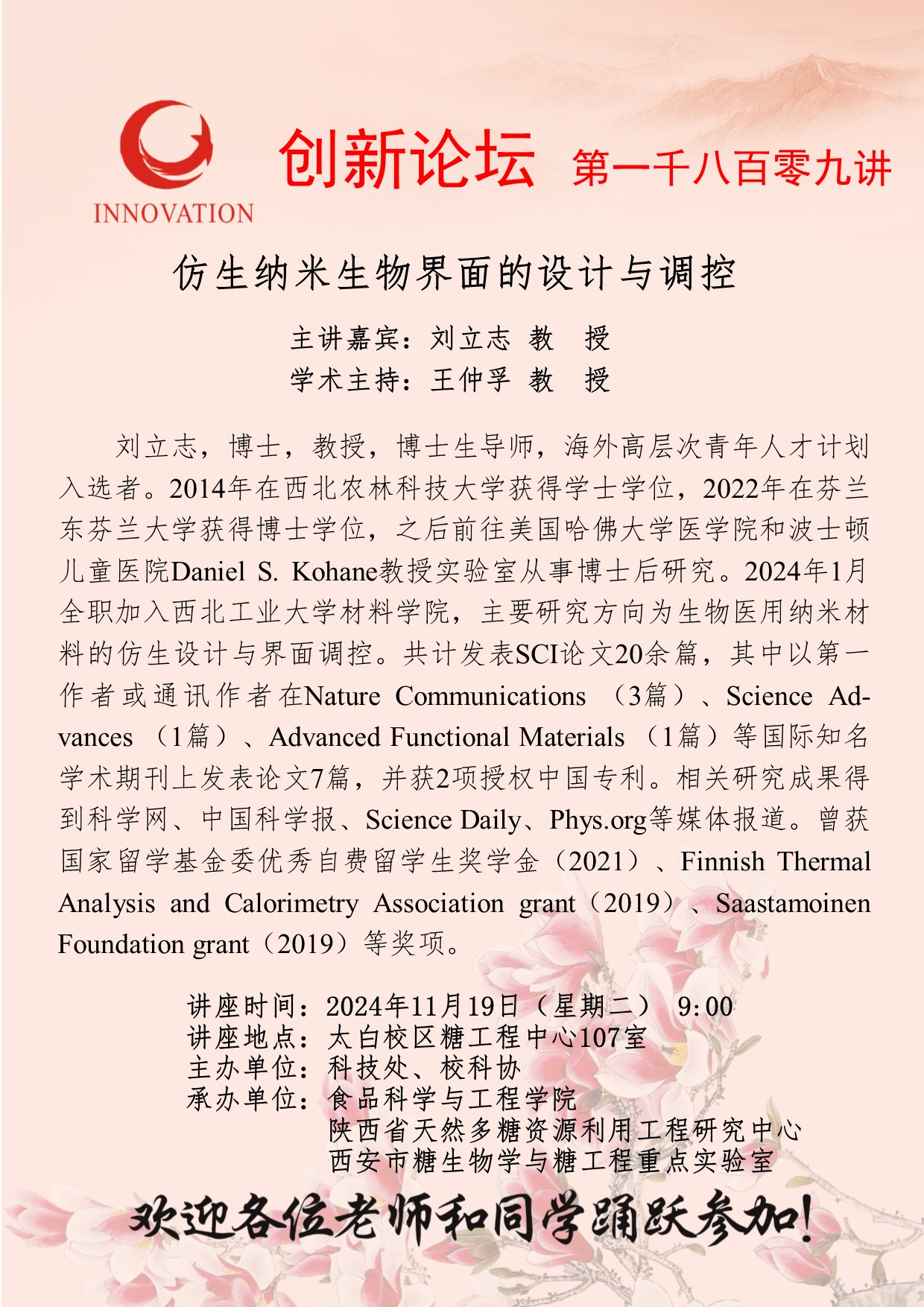 刘立志 教授 8868体育登录创新论坛第一千八百零九讲:仿生纳米生物界面的设计与调控 讲座时间 2024年11月19日(星期二) 9:00 讲座地点 太白校区糖工程中心107室 讲座人介绍 刘立志 教授 讲座内容