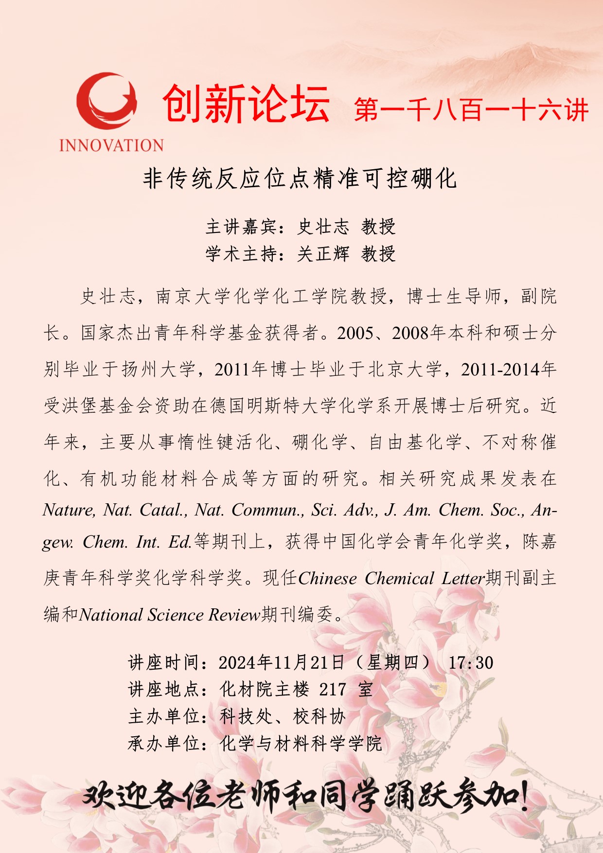 史壮志 教授 8868体育登录创新论坛第一千八百一十六讲:非传统反应位点精准可控硼化 讲座时间 2024年11月21日(星期四) 17:30 讲座地点 化材院主楼 217 室 讲座人介绍 史壮志 教授 讲座内容