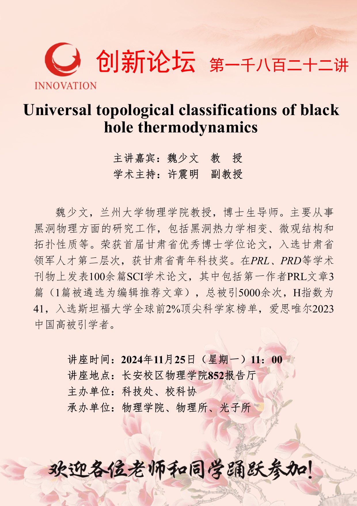 魏少文 教授 8868体育登录创新论坛第一千八百二十二讲:Universal topological classifications of black hole thermodynamics 讲座时间 2024年11月25日(星期一)11:00 讲座地点 长安校区物理学院852报告厅 讲座人介绍 魏少文 教授 讲座内容