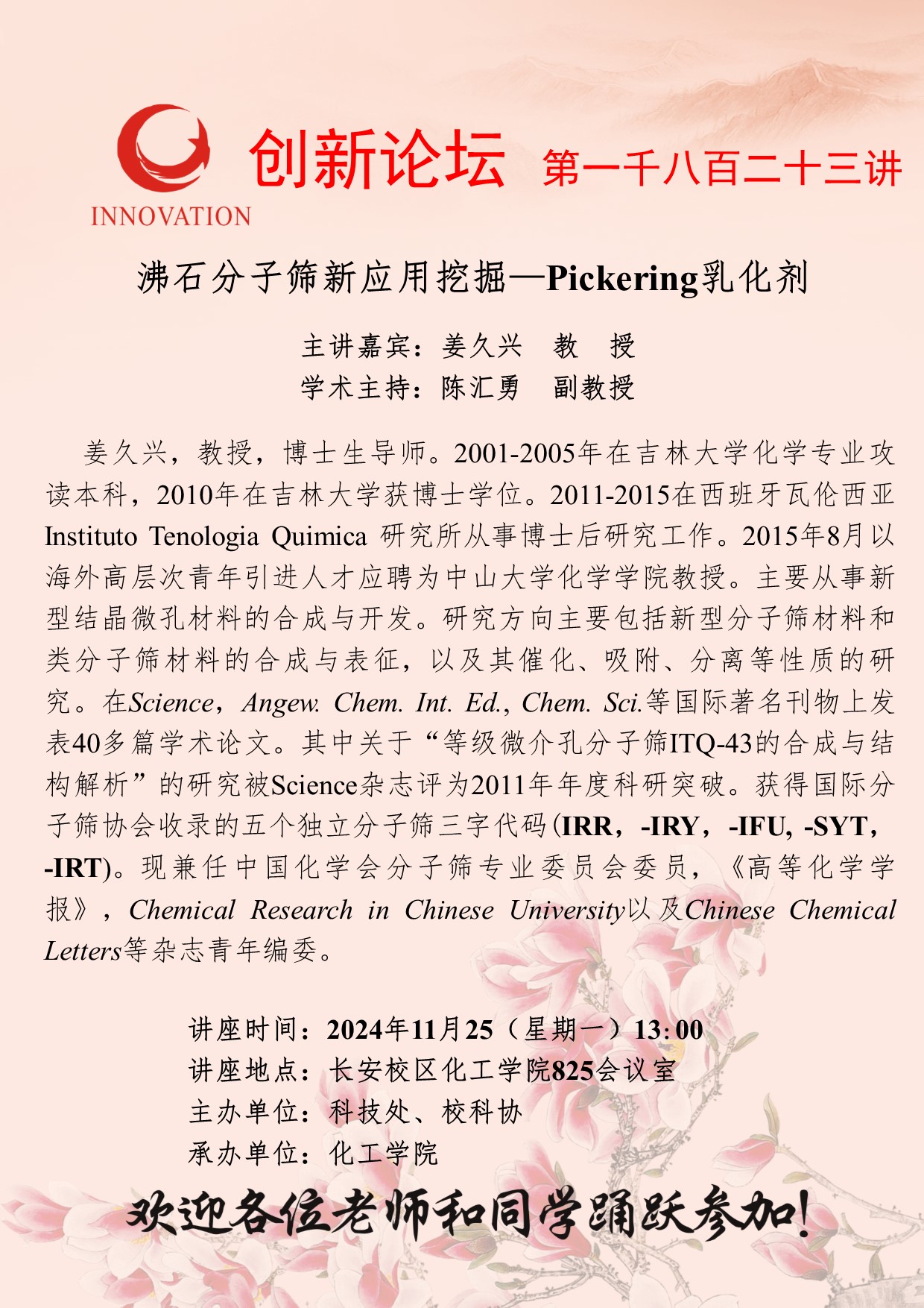 姜久兴 教授 8868体育登录创新论坛第一千八百二十三讲:沸石分子筛新应用挖掘—Pickering乳化剂 讲座时间 2024年11月25(星期一)13:00 讲座地点 8868体育登录长安校区化工学院825会议室 讲座人介绍 姜久兴 教授 讲座内容