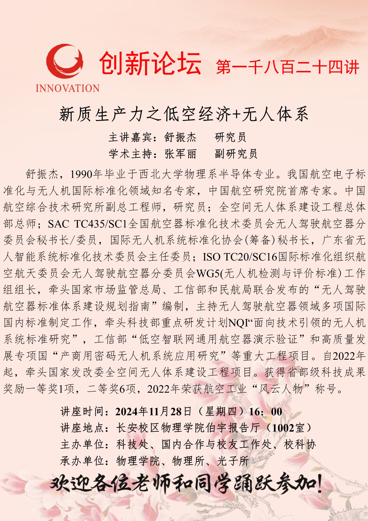 舒振杰 研究员 8868体育登录创新论坛第一千八百二十四讲:新质生产力之低空经济+无人体系 讲座时间 2024年11月28日(星期四)16:00 讲座地点 长安校区物理学院伯宇报告厅(1002室) 讲座人介绍 舒振杰 研究员 讲座内容