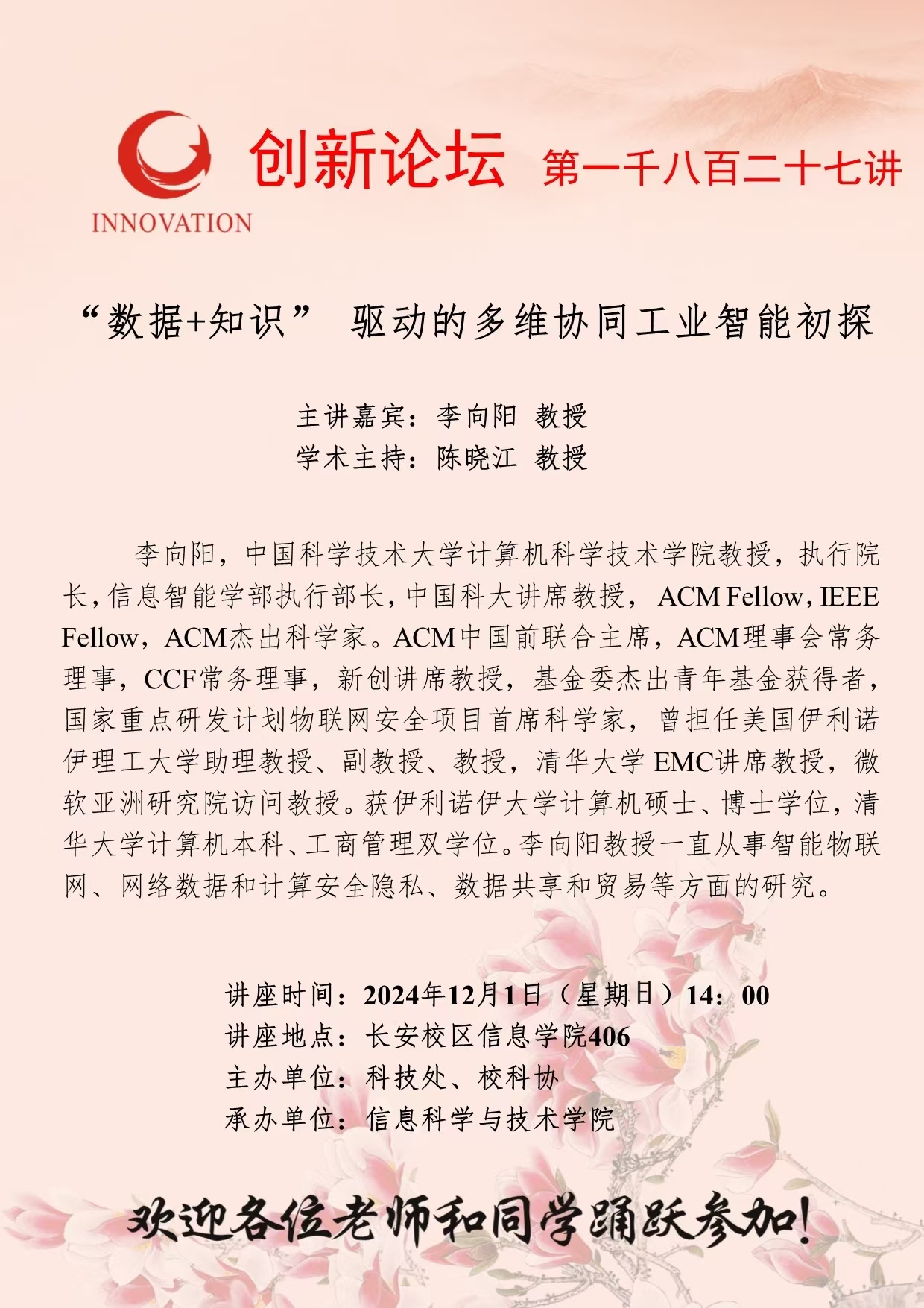 李向阳 教授 8868体育登录创新论坛第一千八百二十七讲:“数据+知识” 驱动的多维协同工业智能初探 讲座时间 2024年12月1日(星期日)14:00 讲座地点 长安校区信息学院406 讲座人介绍 李向阳 教授 讲座内容