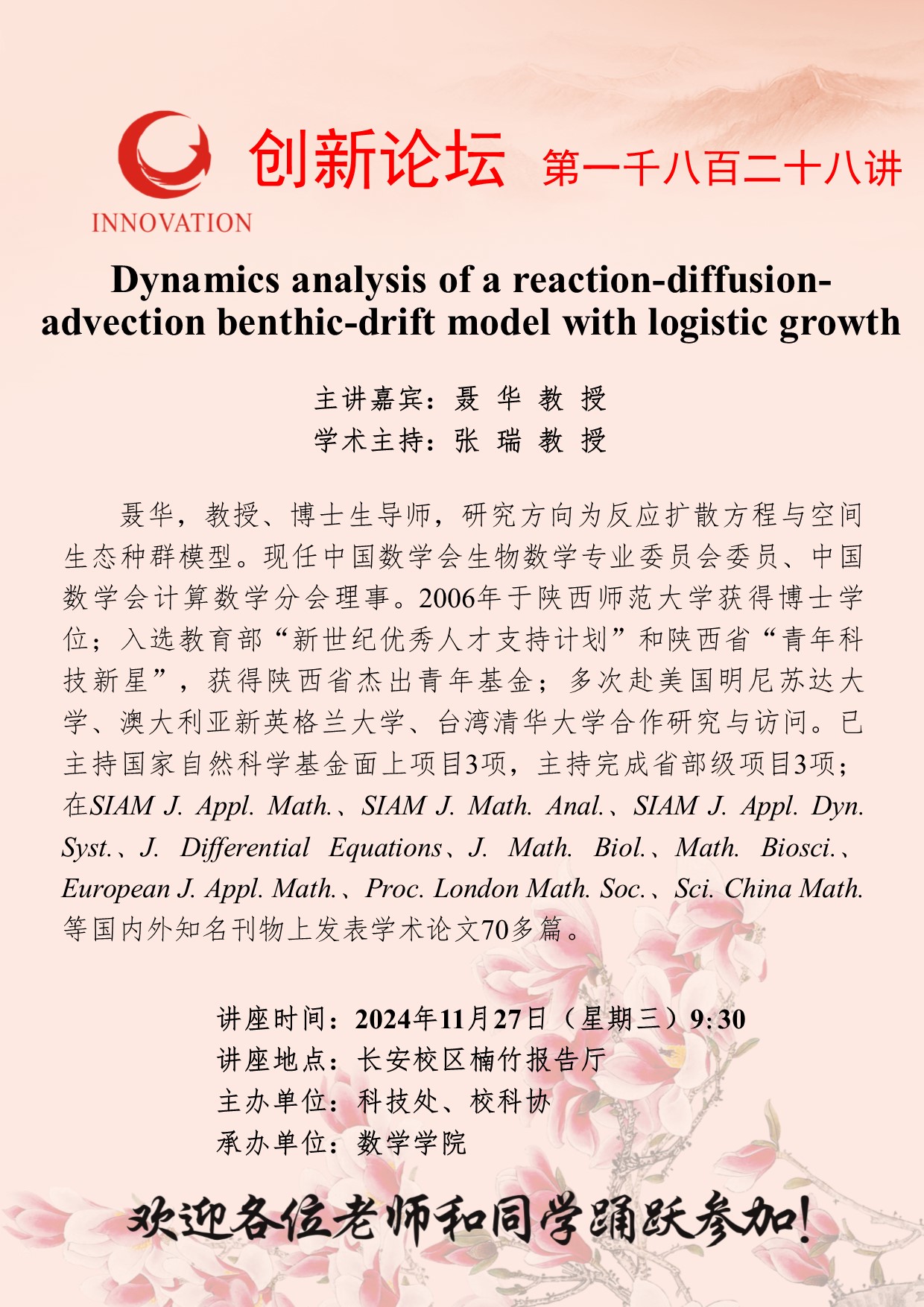 聂华 教授 8868体育登录创新论坛第一千八百二十八讲:Dynamics analysis of a reaction-diffusion-advection benthic-drift model with logistic growth 讲座时间 2024年11月27日(星期三)9:30 讲座地点 长安校区楠竹报告厅 讲座人介绍 聂华 教授 讲座内容