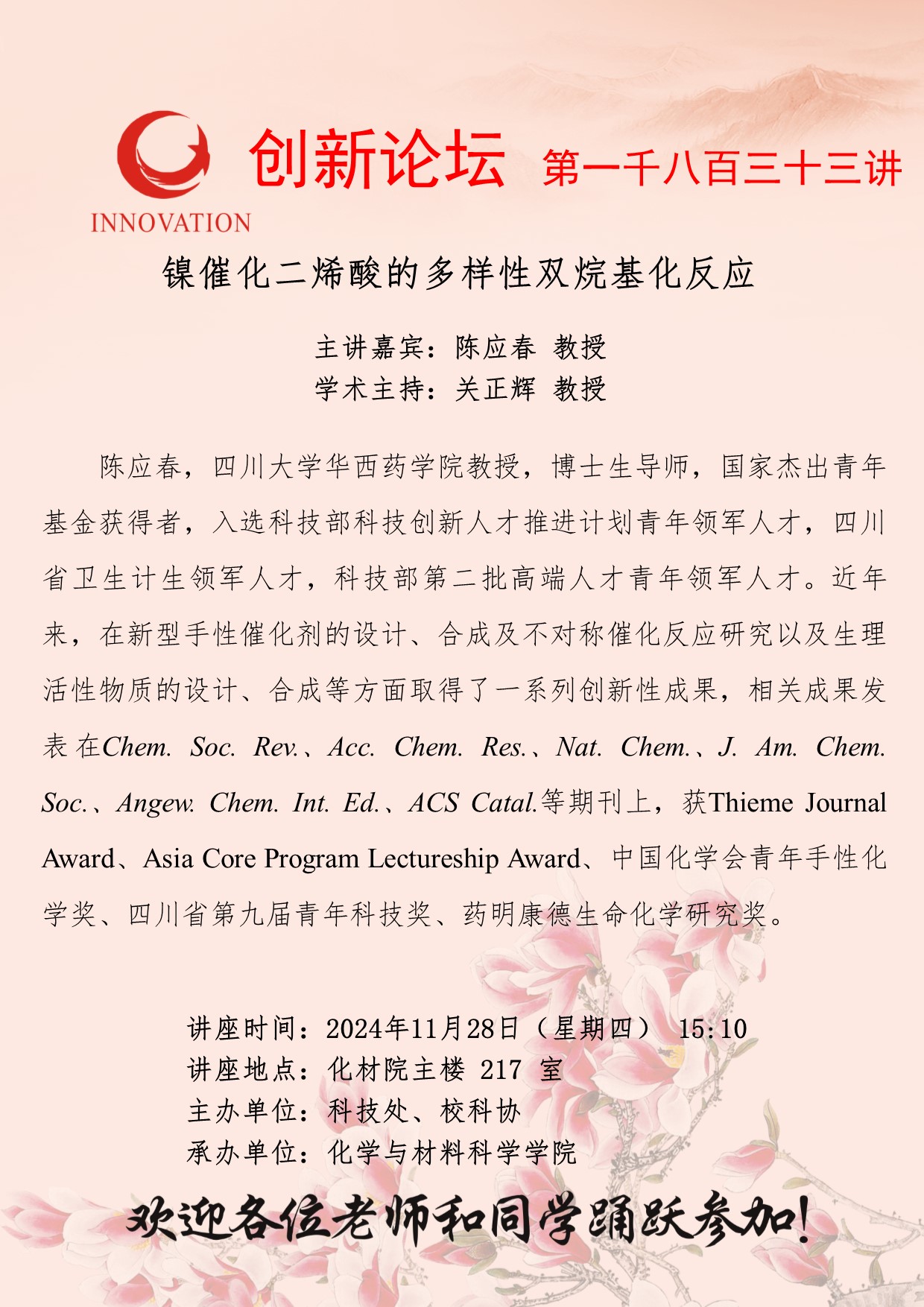陈应春 教授 8868体育登录创新论坛第一千八百三十三讲:镍催化二烯酸的多样性双烷基化反应 讲座时间 2024年11月28日(星期四) 15:10 讲座地点 化材院主楼217室 讲座人介绍 陈应春 教授 讲座内容
