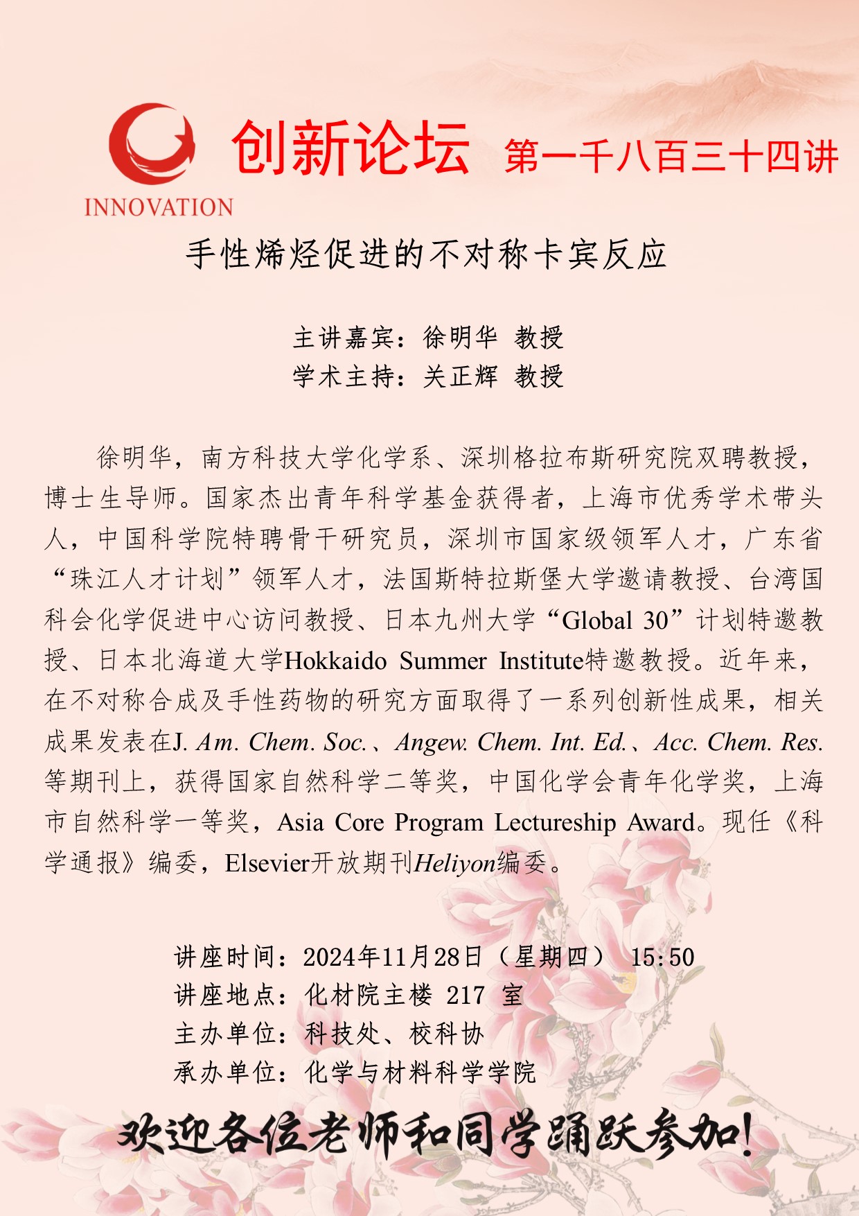 徐明华 教授 8868体育登录创新论坛第一千八百三十四讲:手性烯烃促进的不对称卡宾反应 讲座时间 2024年11月28日(星期四) 15:50 讲座地点 化材院主楼217室 讲座人介绍 徐明华 教授 讲座内容