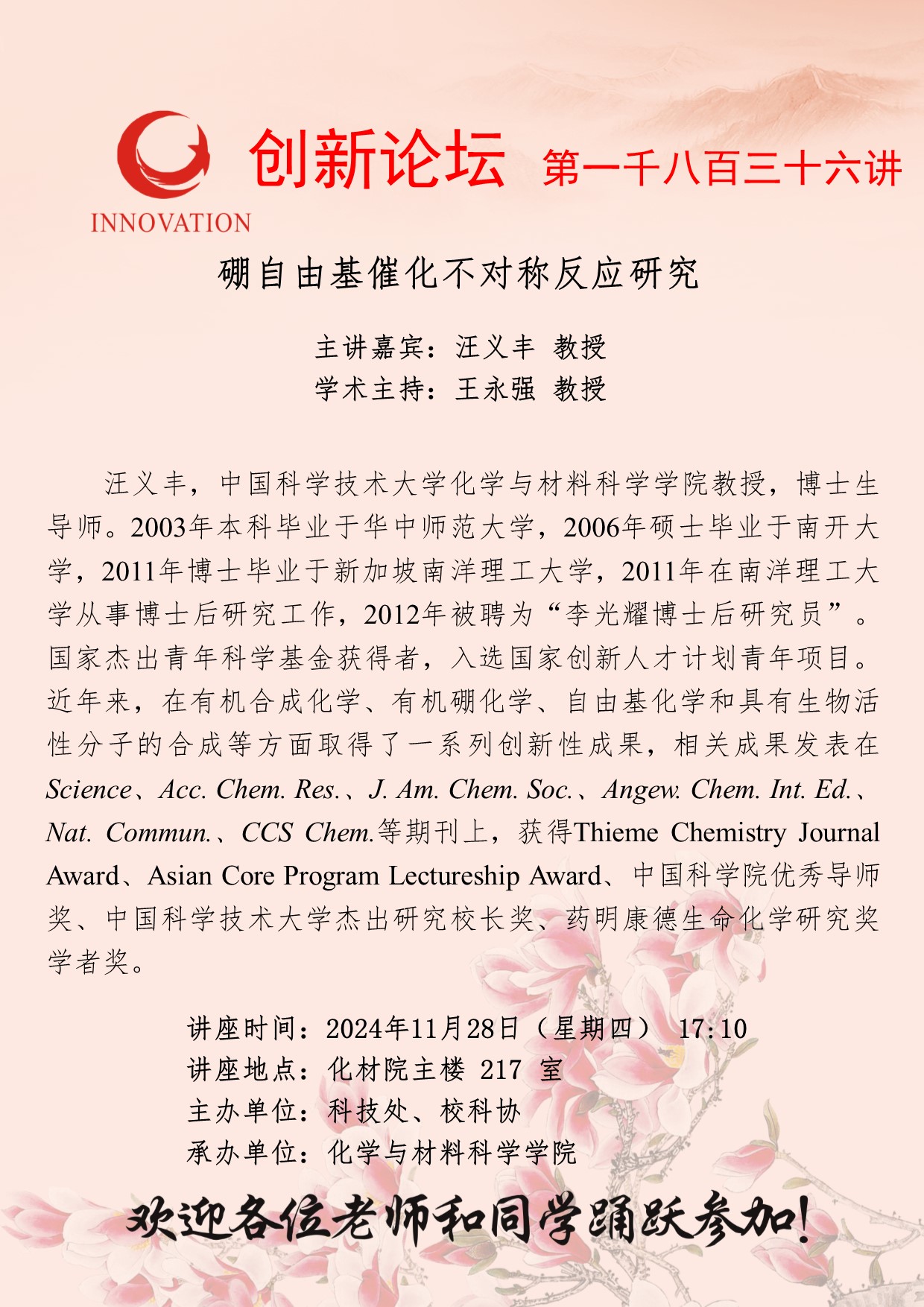 汪义丰 教授 8868体育登录创新论坛第一千八百三十六讲:硼自由基催化不对称反应研究 讲座时间 2024年11月28日(星期四) 17:10 讲座地点 化材院主楼217室 讲座人介绍 汪义丰 教授 讲座内容