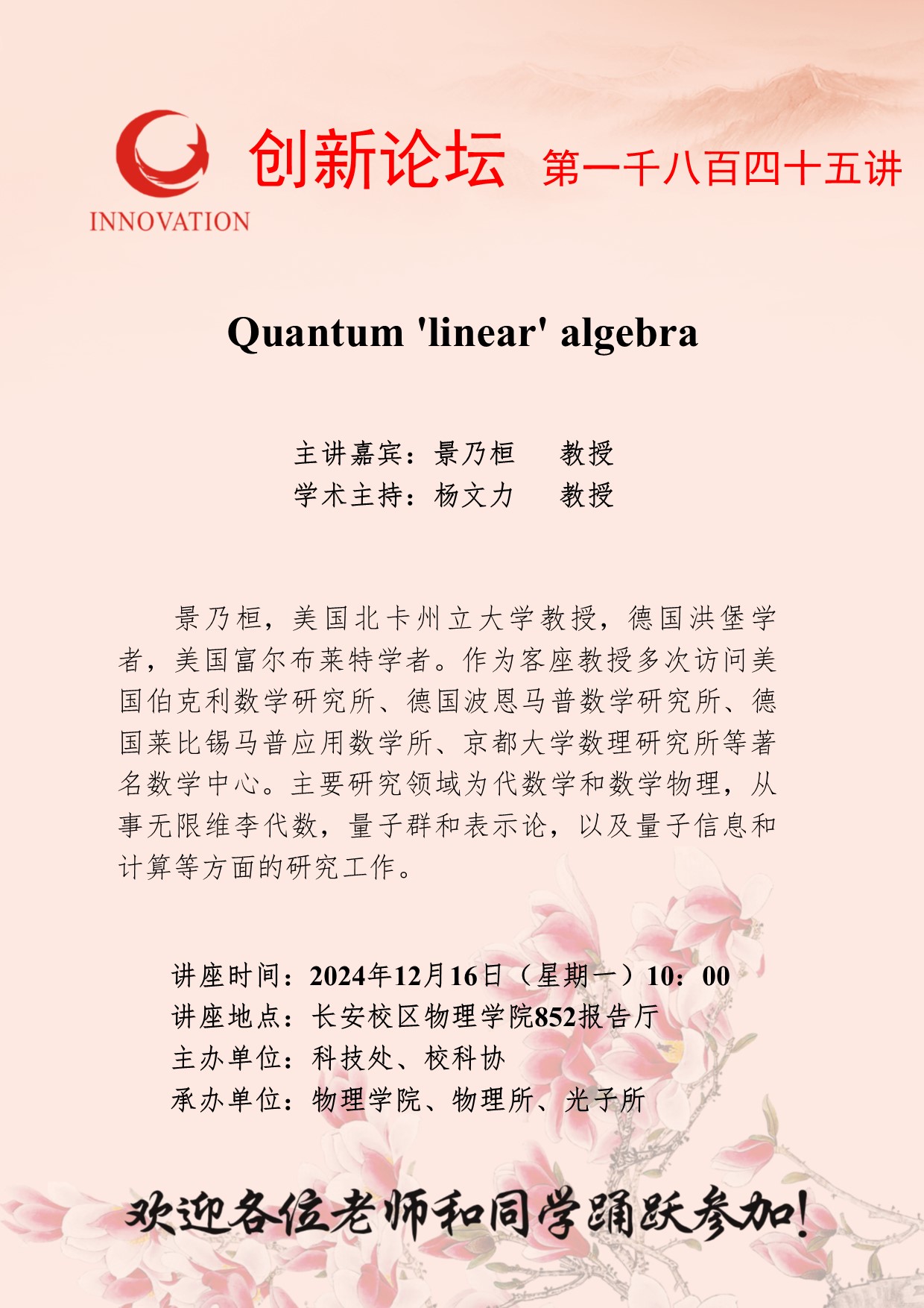 景乃桓 教授 8868体育登录创新论坛第一千八百四十五讲:Quantum 'linear' algebra 讲座时间 2024年12月16日(星期一)10:00 讲座地点 长安校区物理学院852报告厅 讲座人介绍 景乃桓 教授 讲座内容