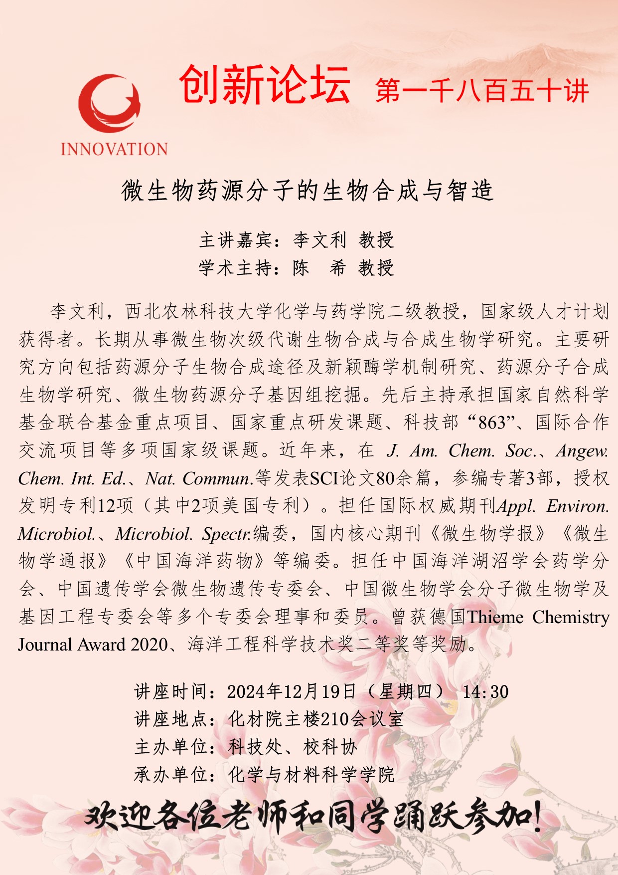 李文利 教授 8868体育登录创新论坛第一千八百五十讲:微生物药源分子的生物合成与智造 讲座时间 2024年12月19日(星期四) 14:30 讲座地点 化材院主楼210会议室 讲座人介绍 李文利 教授 讲座内容