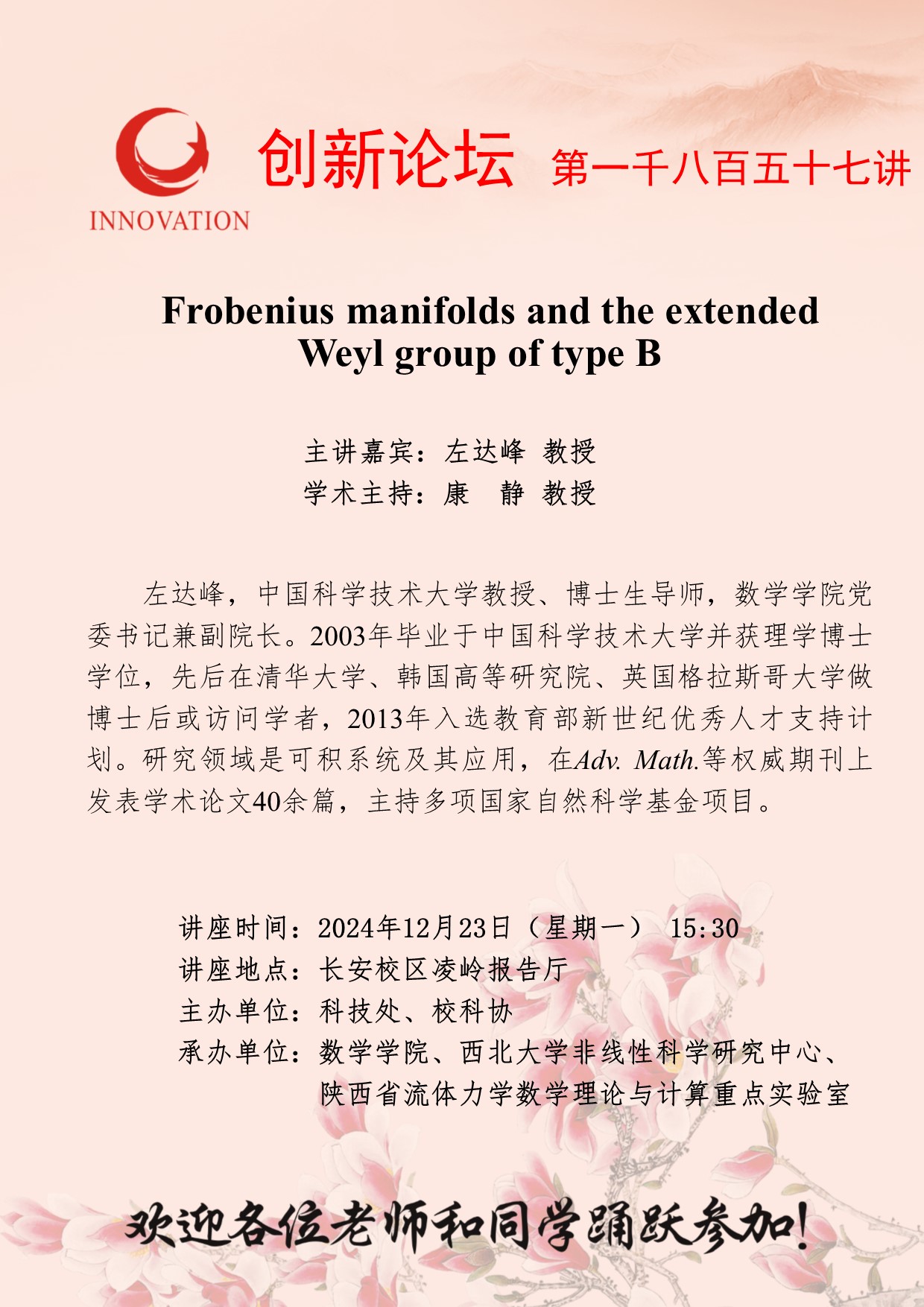 左达峰 教授 8868体育登录创新论坛第一千八百五十七讲:Frobenius manifolds and the extended Weyl group of type B 讲座时间 2024年12月23日(星期一) 15:30 讲座地点 长安校区凌岭报告厅 讲座人介绍 左达峰 教授 讲座内容