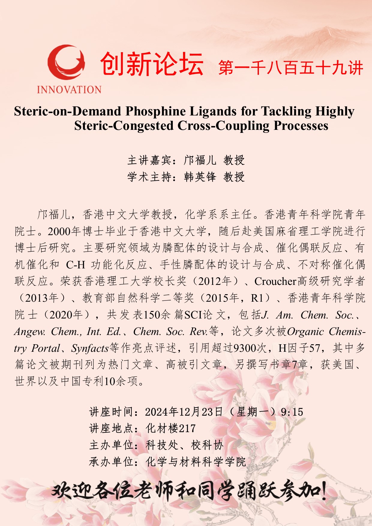 邝福儿 教授 8868体育登录创新论坛第一千八百五十九讲:Steric-on-Demand Phosphine Ligands for Tackling Highly Steric-Congested Cross-Coupling Processes 讲座时间 2024年12月23日(星期一)9:15 讲座地点 化材楼217 讲座人介绍 邝福儿 教授 讲座内容