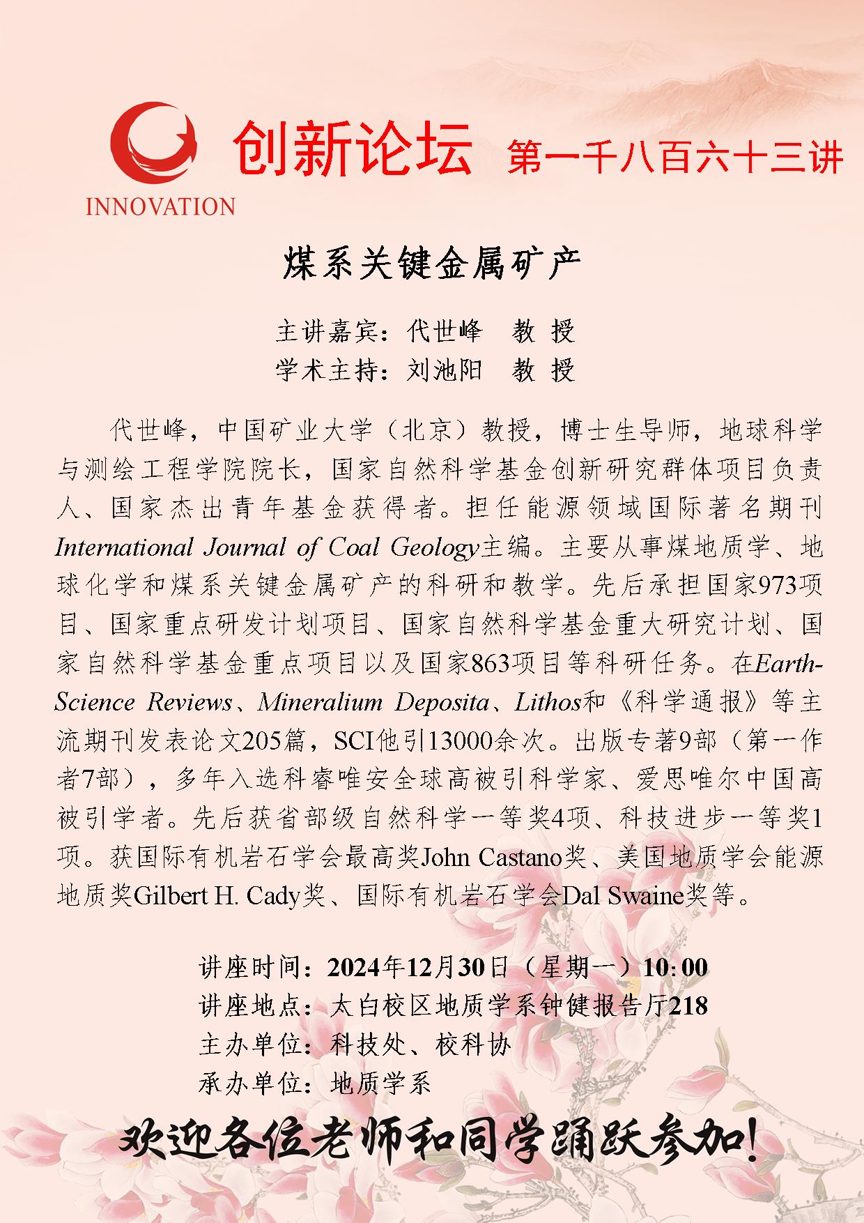 代世峰 教授 8868体育登录创新论坛第一千八百六十三讲:煤系关键金属矿产 讲座时间 2024年12月30日(星期一)10:00 讲座地点 太白校区地质学系钟健报告厅218 讲座人介绍 代世峰 教授 讲座内容