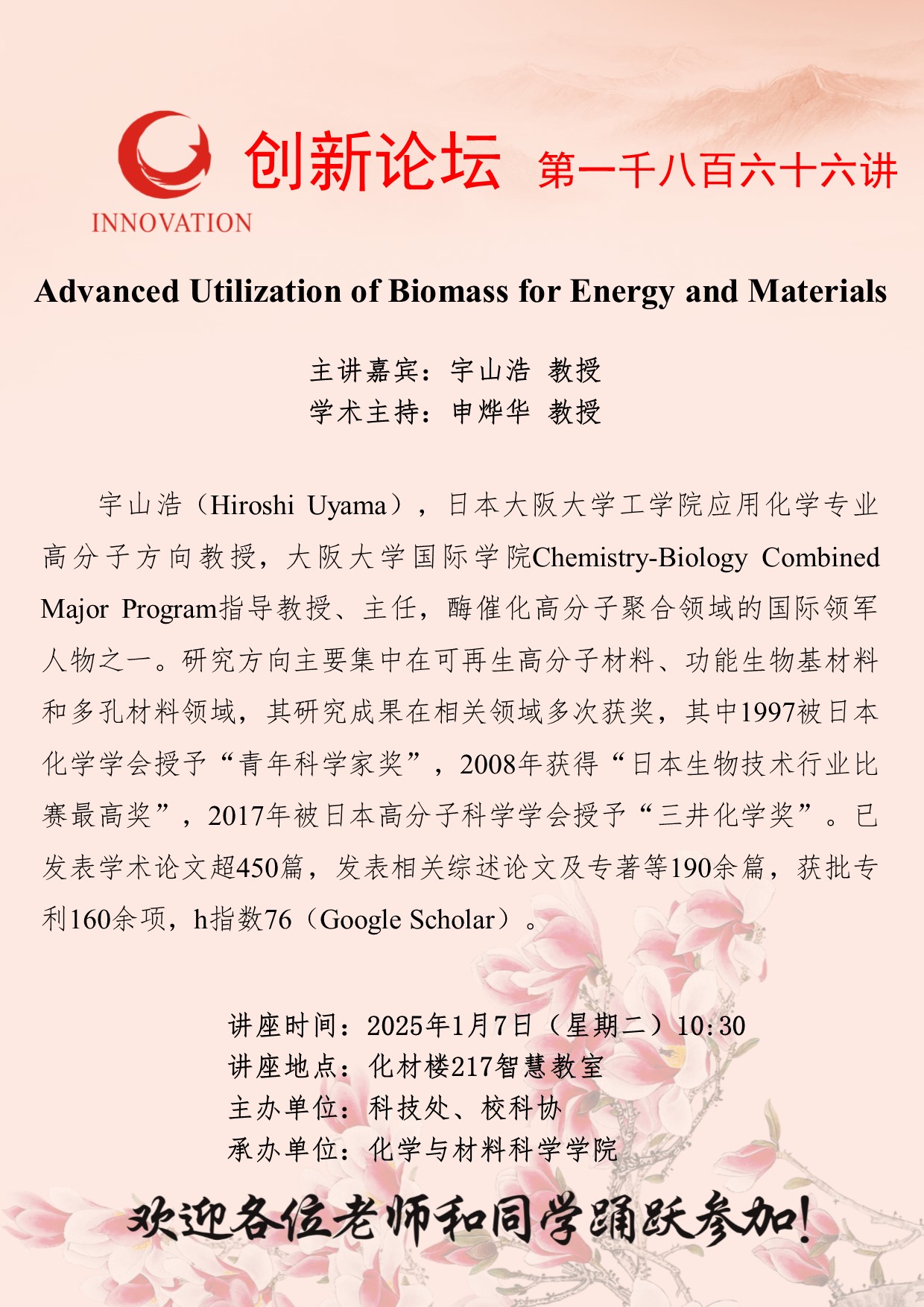 宇山浩 教授 8868体育登录创新论坛第一千八百六十六讲:Advanced Utilization of Biomass for Energy and Materials 讲座时间 2025年1月7日(星期二)10:30 讲座地点 化材楼217智慧教室 讲座人介绍 宇山浩 教授 讲座内容