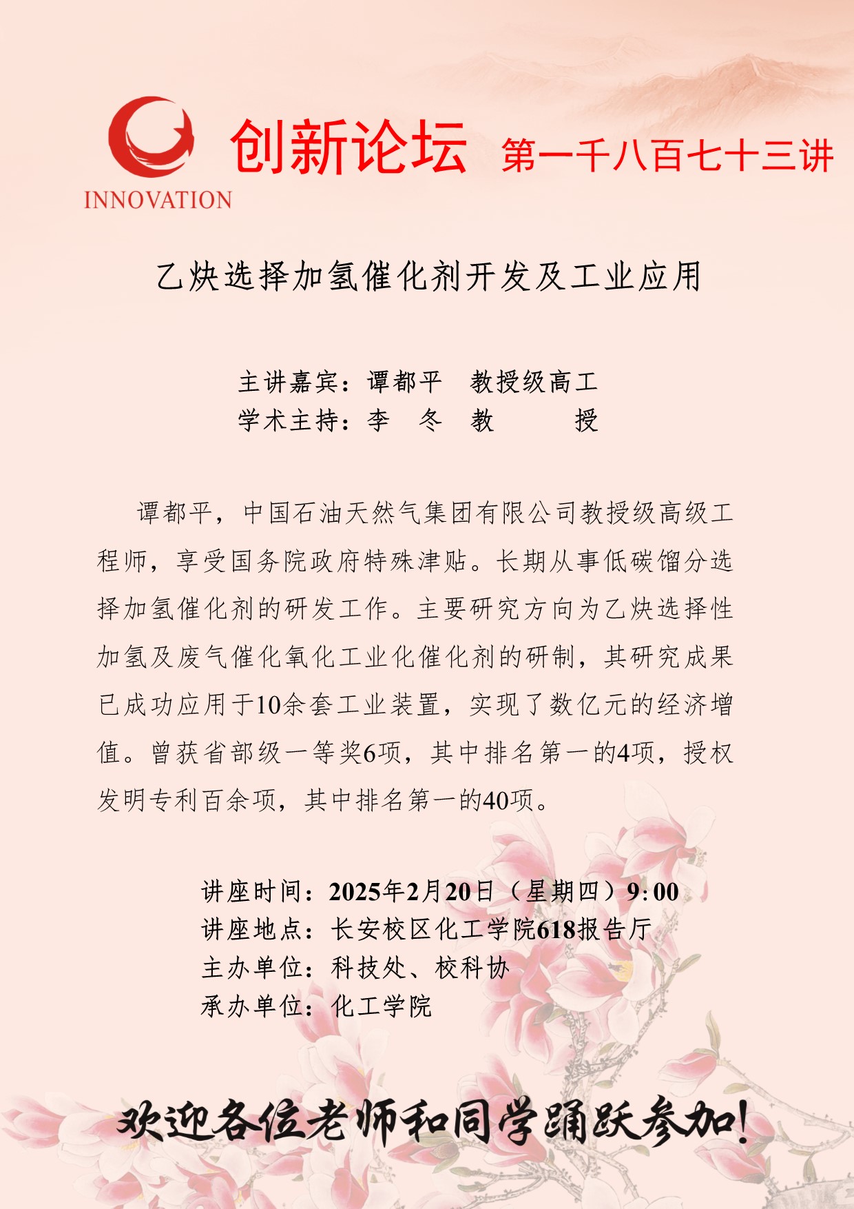 谭都平 教授级高工 8868体育登录创新论坛第一千八百七十三讲:乙炔选择加氢催化剂开发及工业应用 讲座时间 2025年2月20日(星期四)9:00 讲座地点 长安校区化工学院618报告厅 讲座人介绍 谭都平 教授级高工 讲座内容