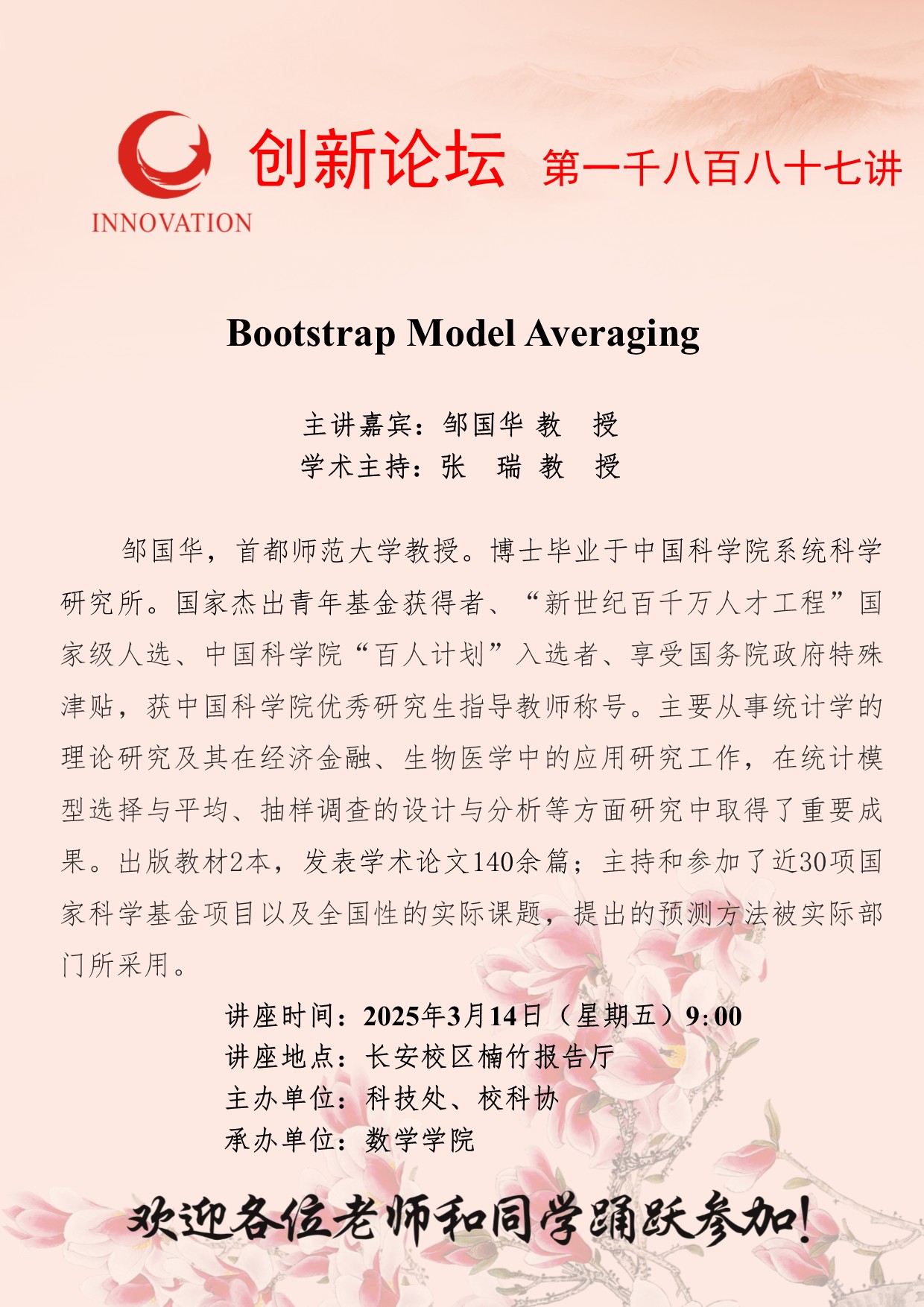 邹国华 教授 8868体育登录创新论坛第一千八百八十七讲:Bootstrap Model Averaging 讲座时间 2025年3月14日(星期五)9:00 讲座地点 长安校区楠竹报告厅 讲座人介绍 邹国华 教授 讲座内容