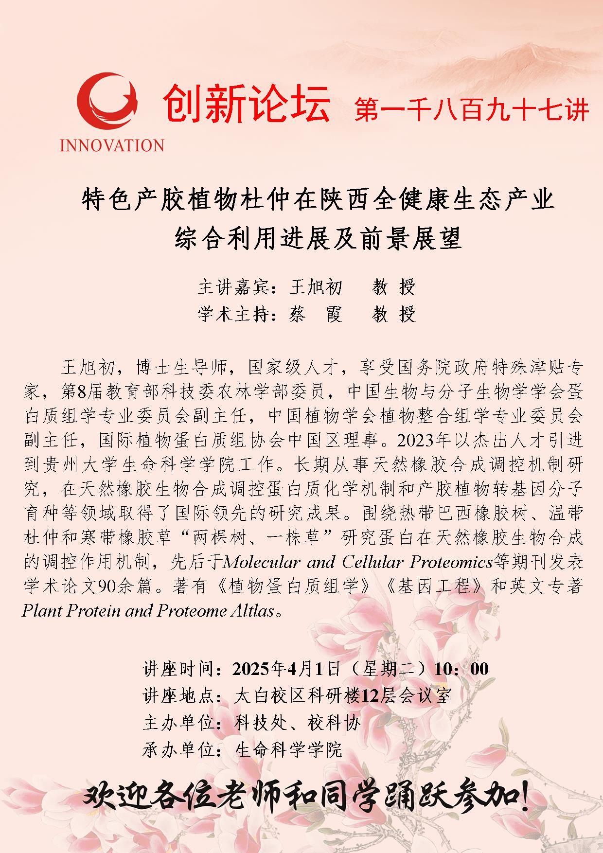 王旭初 教授 8868体育登录创新论坛第一千八百九十七讲:特色产胶植物杜仲在陕西全健康生态产业综合利用进展及前景展望 讲座时间 2025年4月1日(星期二)10:00 讲座地点 太白校区科研楼12层会议室 讲座人介绍 王旭初 教授 讲座内容