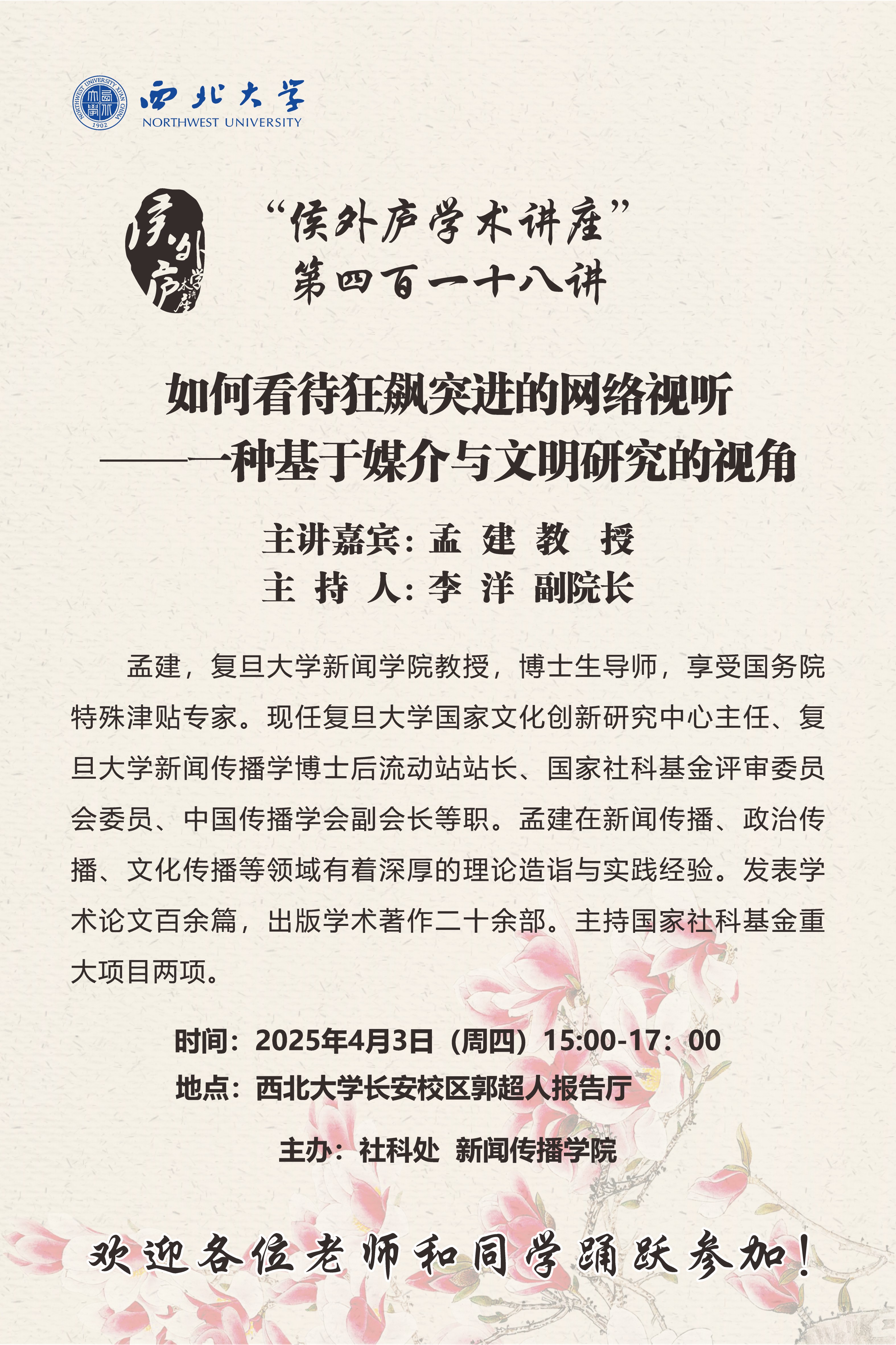 孟建 教授 “侯外庐学术讲座”第四百一十八讲:如何看待狂飙突进的网络视听——一种基于媒介与文明研究的视角 讲座时间 2025年4月3日(周四)15:00-17:00 讲座地点 8868体育登录长安校区郭超人报告厅 讲座人介绍 孟建 教授 讲座内容