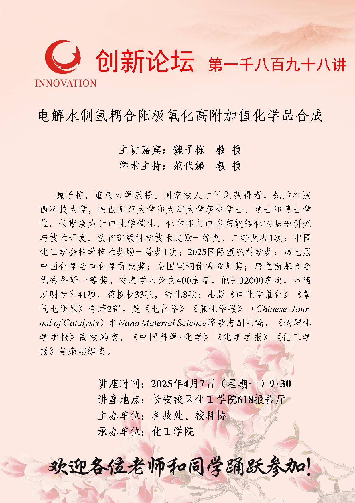 魏子栋 教授 8868体育登录创新论坛第一千八百九十八讲:电解水制氢耦合阳极氧化高附加值化学品合成 讲座时间 2025年4月7日(星期一)9:30 讲座地点 长安校区化工学院618报告厅 讲座人介绍 魏子栋 教授 讲座内容