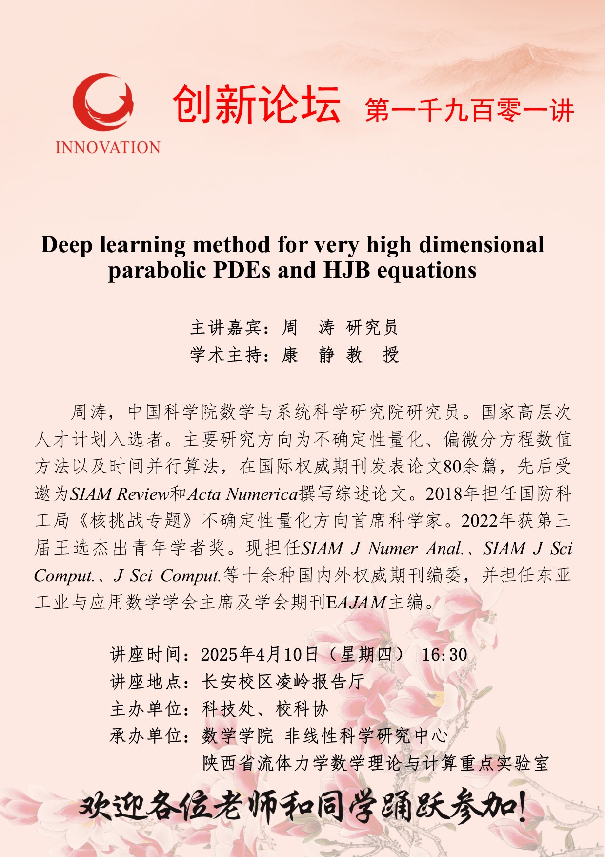 周涛 研究员 8868体育登录创新论坛第一千九百零一讲:Deep learning method for very high dimensional parabolic PDEs and HJB equations 讲座时间 2025年4月10日(星期四) 16:30 讲座地点 长安校区凌岭报告厅 讲座人介绍 周涛 研究员 讲座内容