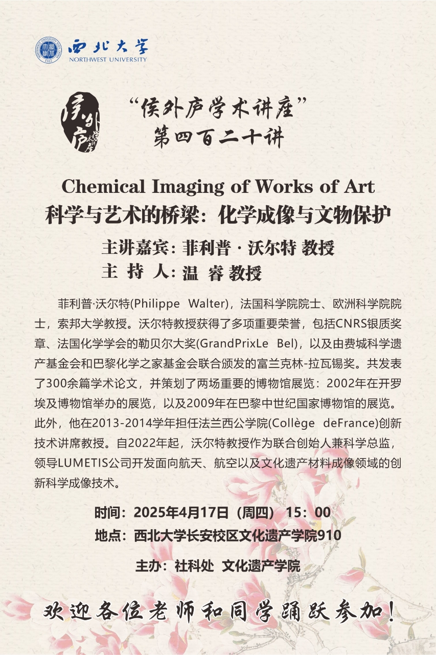 菲利普·沃尔特 教授 “侯外庐学术讲座”第四百二十讲:Chemical Imaging of Works of Art科学与艺术的桥梁:化学成像与文物保护 讲座时间 2025年4月17日(周四)15:00 讲座地点 8868体育登录长安校区文化遗产学院910 讲座人介绍 菲利普·沃尔特 教授 讲座内容