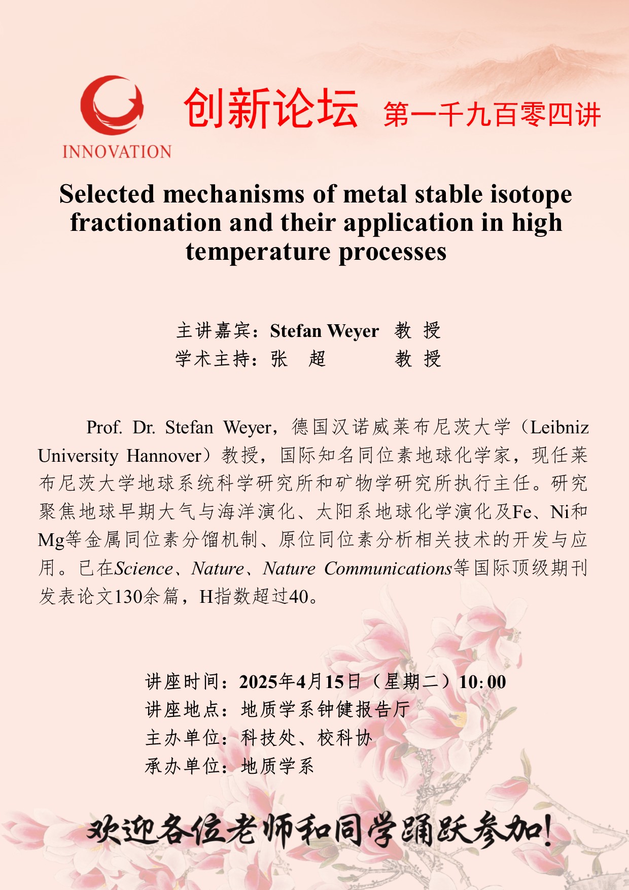 Stefan Weyer 教授 8868体育登录创新论坛第一千九百零四讲:Selected mechanisms of metal stable isotope fractionation and their application in high temperature processes 讲座时间 2025年4月15日(星期二)10:00 讲座地点 地质学系钟健报告厅 讲座人介绍 Stefan Weyer 教授 讲座内容