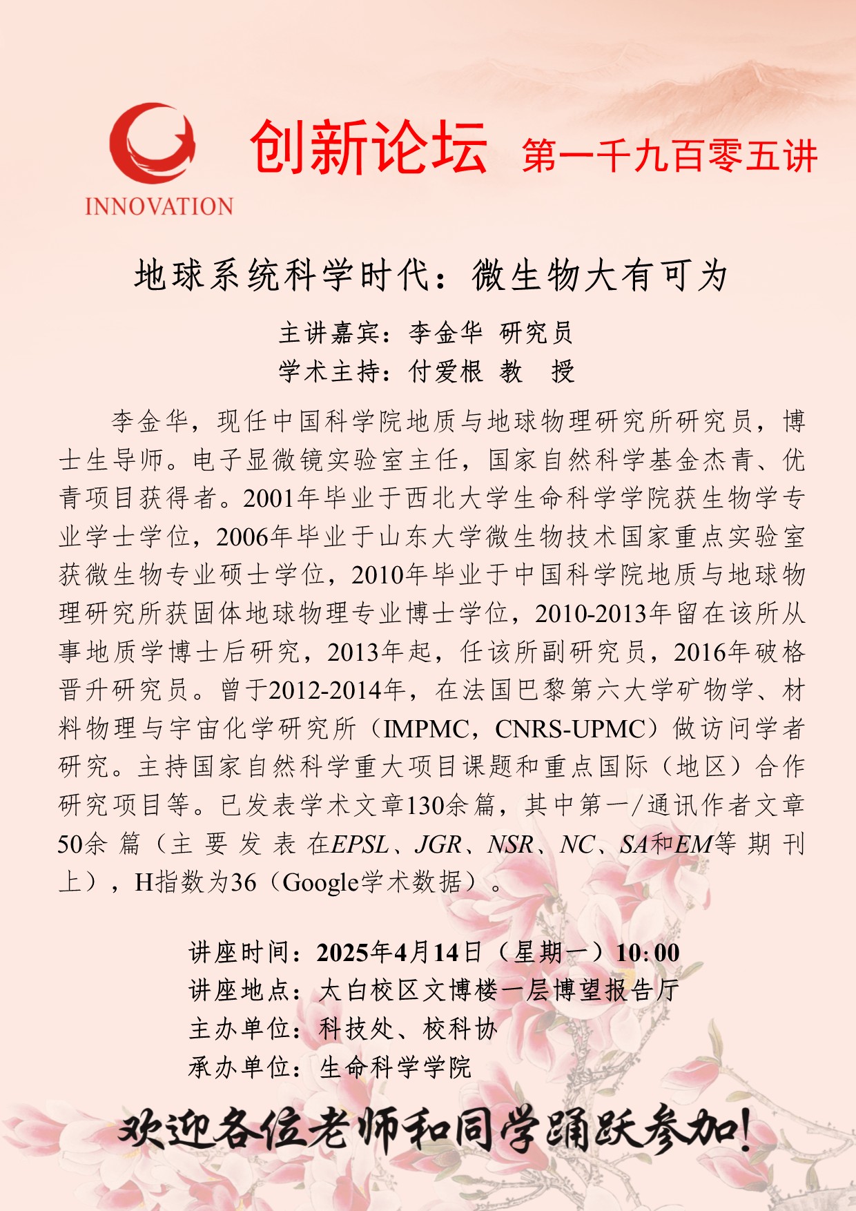 李金华 研究员 8868体育登录创新论坛第一千九百零五讲:地球系统科学时代:微生物大有可为 讲座时间 2025年4月14日(星期一)10:00 讲座地点 太白校区文博楼一层博望报告厅 讲座人介绍 李金华 研究员 讲座内容