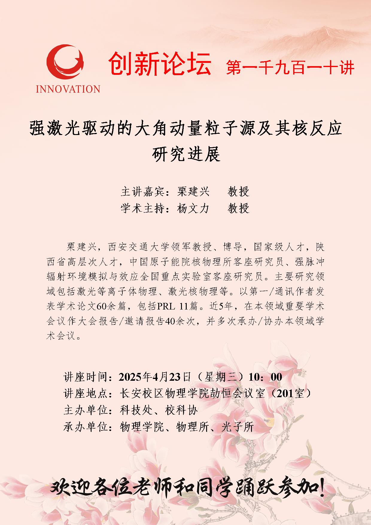 栗建兴 教授 8868体育登录创新论坛第一千九百一十讲:强激光驱动的大角动量粒子源及其核反应研究进展 讲座时间 2025年4月23日(星期三)10:00 讲座地点 长安校区物理学院劼恒会议室(201室) 讲座人介绍 栗建兴 教授 讲座内容