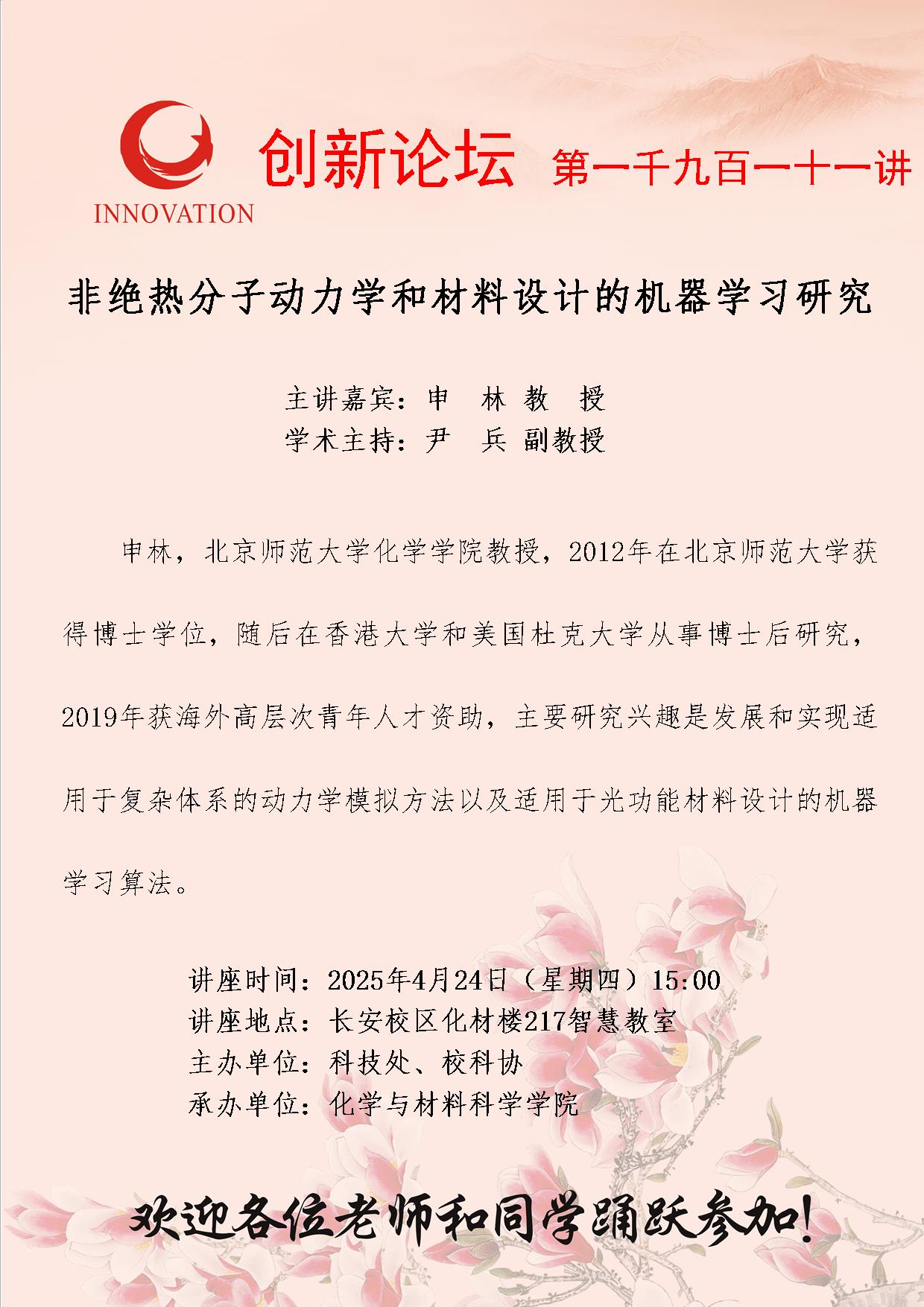 申林 教授 8868体育登录创新论坛第一千九百一十一讲:非绝热分子动力学和材料设计的机器学习研究 讲座时间 2025年4月24日(星期四)15:00 讲座地点 长安校区化材楼217智慧教室 讲座人介绍 申林 教授 讲座内容