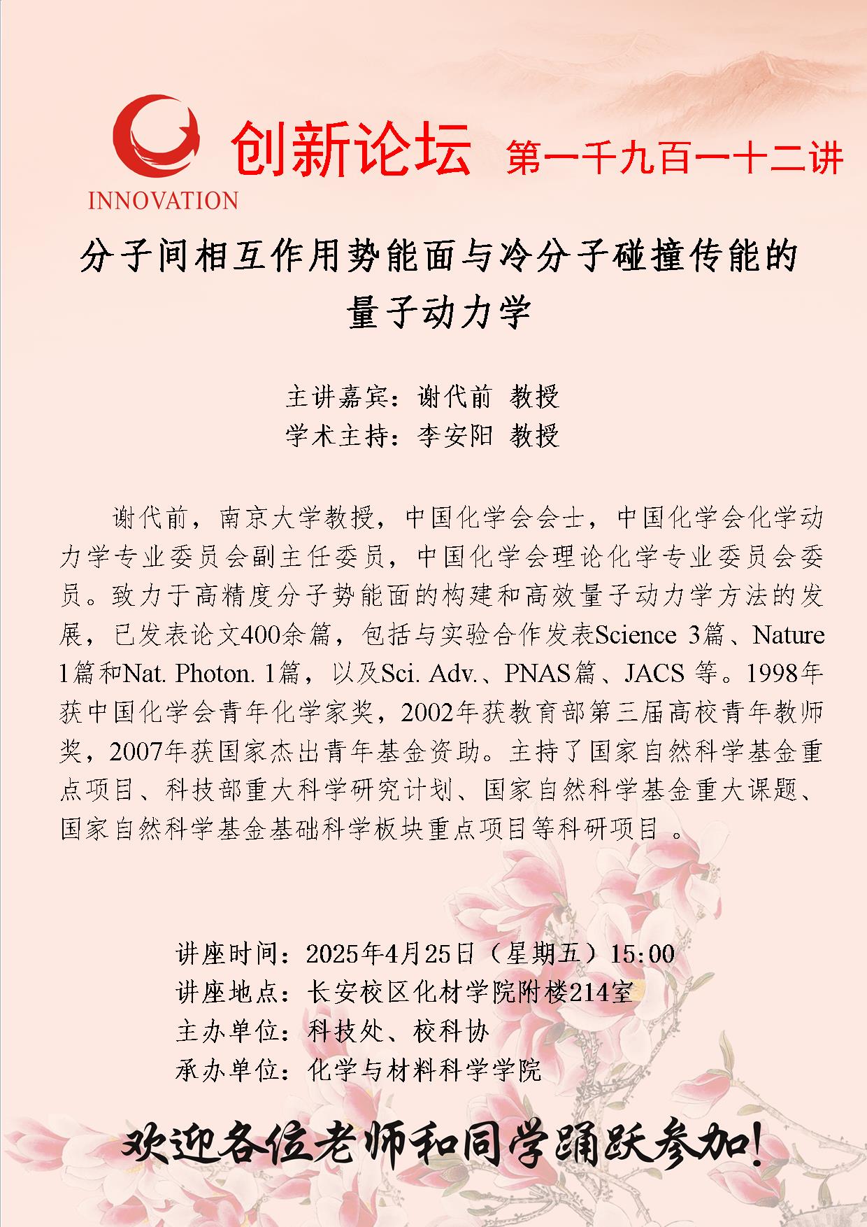 谢代前 教授 8868体育登录创新论坛第一千九百一十二讲:分子间相互作用势能面与冷分子碰撞传能的量子动力学 讲座时间 2025年4月25日(星期五)15:00 讲座地点 长安校区化材学院附楼214室 讲座人介绍 谢代前 教授 讲座内容