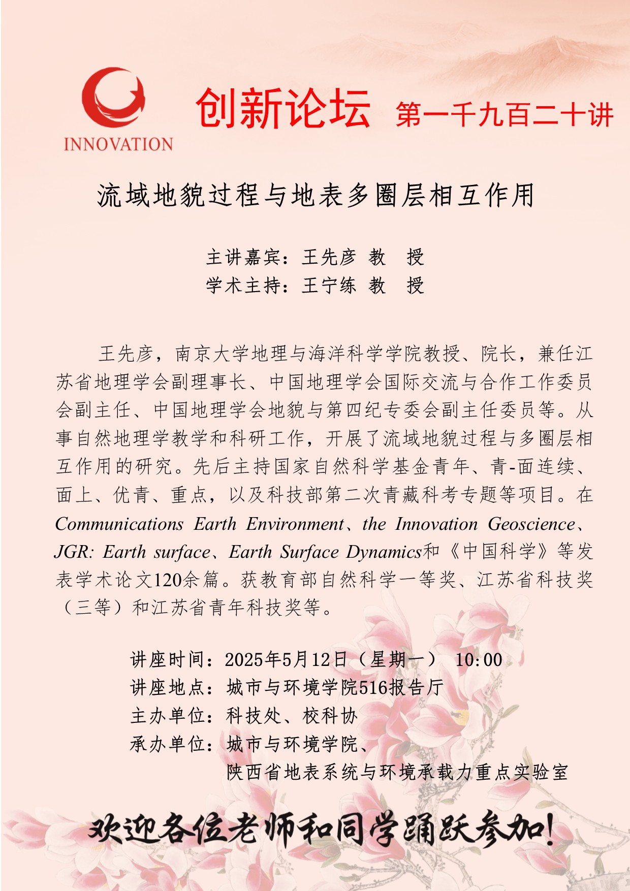 王先彦 教授 8868体育登录创新论坛第一千九百二十讲:流域地貌过程与地表多圈层相互作用 讲座时间 2025年5月12日(星期一) 10:00 讲座地点 城市与环境学院516报告厅 讲座人介绍 王先彦 教授 讲座内容