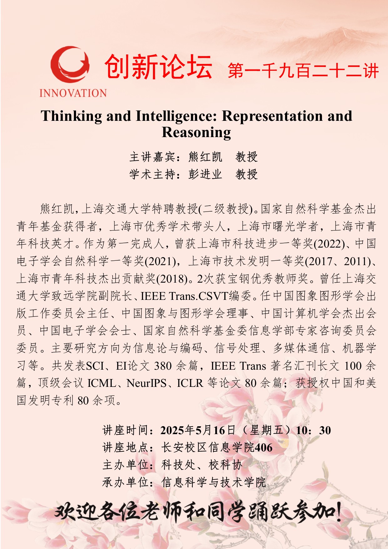熊红凯 教授 8868体育登录创新论坛第一千九百二十二讲:Thinking and Intelligence: Representation and Reasoning 讲座时间 2025年5月16日(星期五)10:30 讲座地点 长安校区信息学院406 讲座人介绍 熊红凯 教授 讲座内容