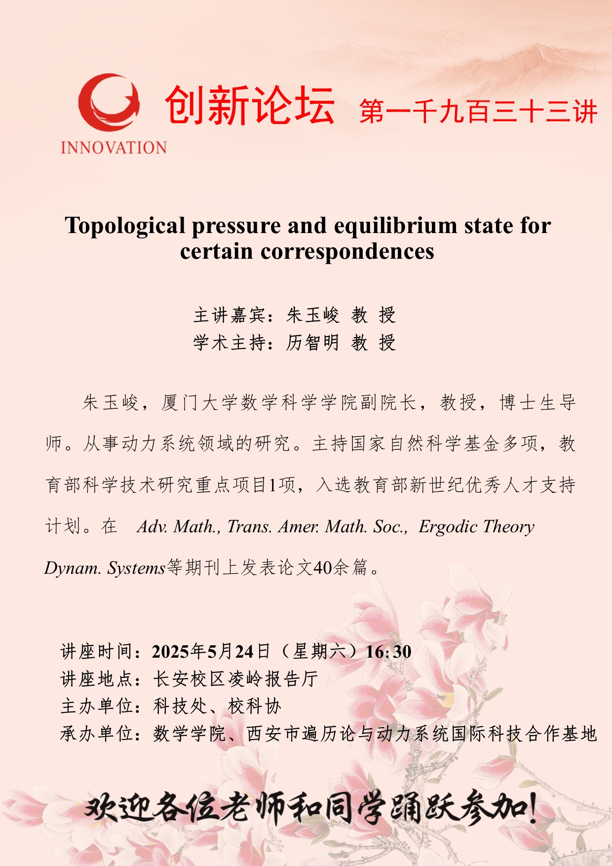 朱玉峻 教授 8868体育登录创新论坛第一千九百三十三讲:Topological pressure and equilibrium state for certain correspondences 讲座时间 2025年5月24日(星期六)16:30 讲座地点 长安校区凌岭报告厅 讲座人介绍 朱玉峻 教授 讲座内容