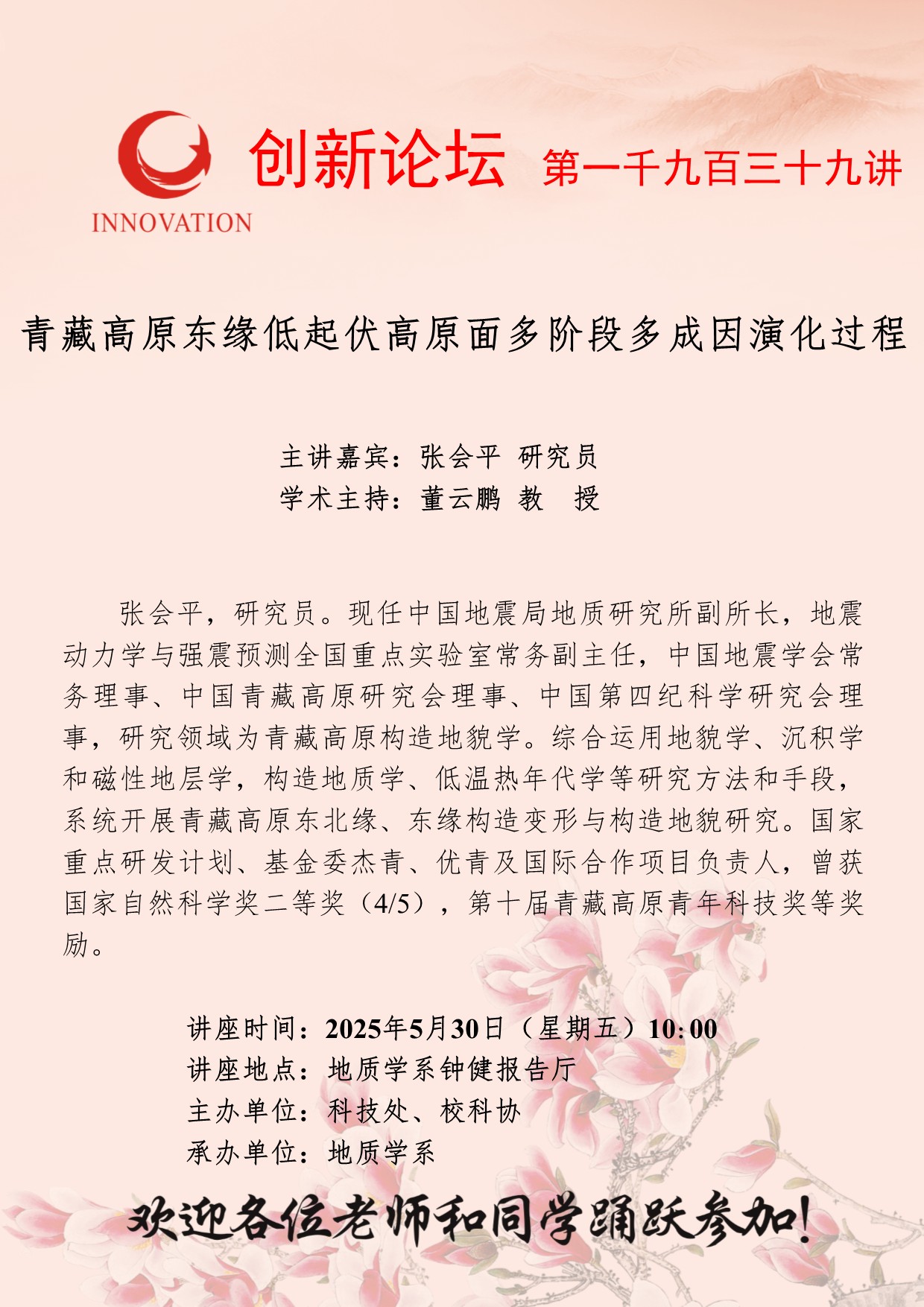 张会平 研究员 8868体育登录创新论坛第一千九百三十九讲:青藏高原东缘低起伏高原面多阶段多成因演化过程 讲座时间 2025年5月30日(星期五)10:00 讲座地点 地质学系钟健报告厅 讲座人介绍 张会平 研究员 讲座内容