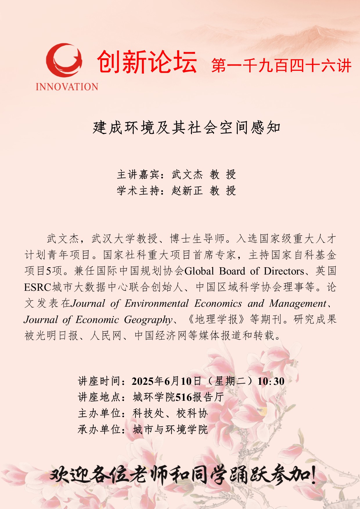 武文杰 教授 8868体育登录创新论坛第一千九百四十六讲:建成环境及其社会空间感知 讲座时间 2025年6月10日(星期二)10:30 讲座地点 城环学院516报告厅 讲座人介绍 武文杰 教授 讲座内容
