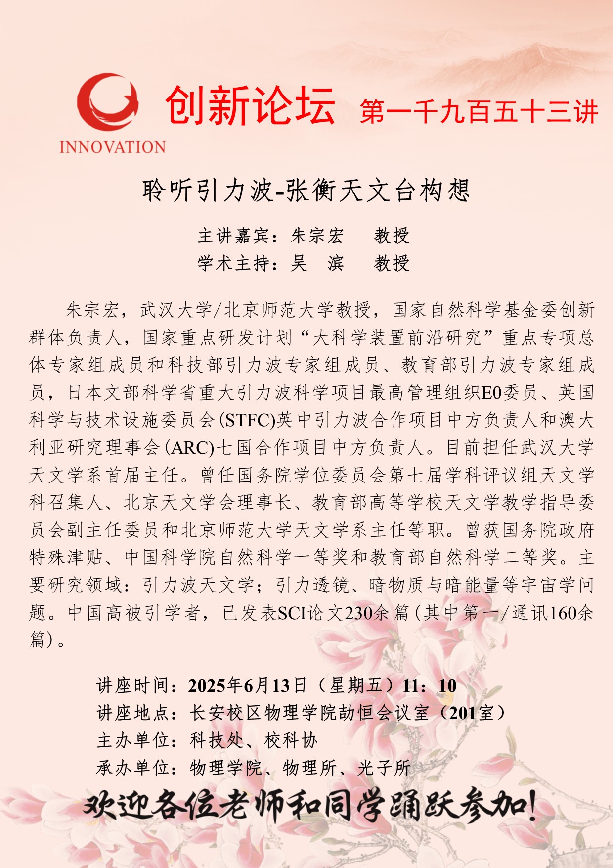 朱宗宏 教授 8868体育登录创新论坛第一千九百五十三讲:聆听引力波-张衡天文台构想 讲座时间 2025年6月13日(星期五)11:10 讲座地点 长安校区物理学院劼恒会议室(201室) 讲座人介绍 朱宗宏 教授 讲座内容