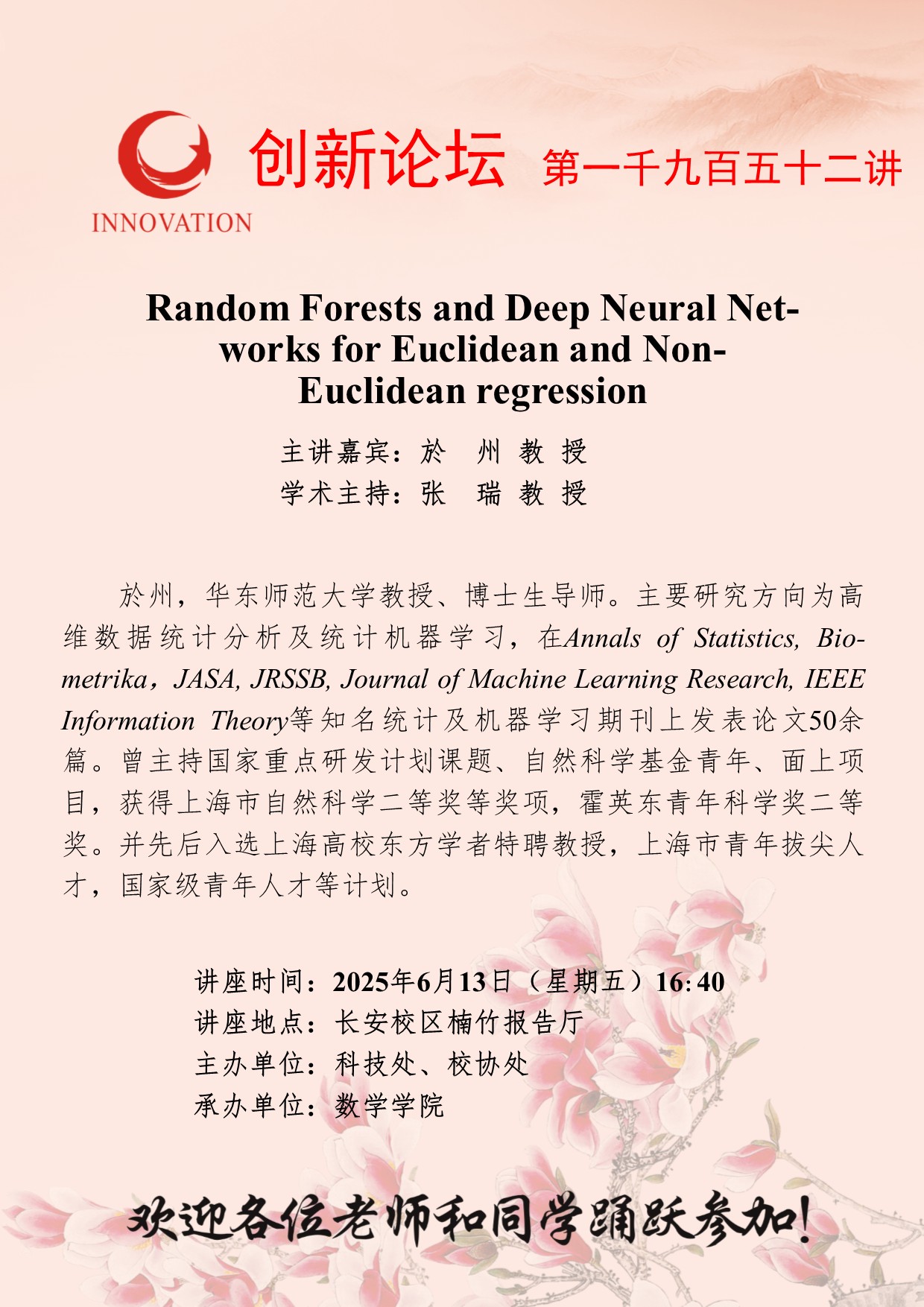 於州 教授 8868体育登录创新论坛第一千九百五十二讲:Random Forests and Deep Neural Networks for Euclidean and Non-Euclidean regression 讲座时间 2025年6月13日(星期五)16:40 讲座地点 长安校区楠竹报告厅 讲座人介绍 於州 教授 讲座内容