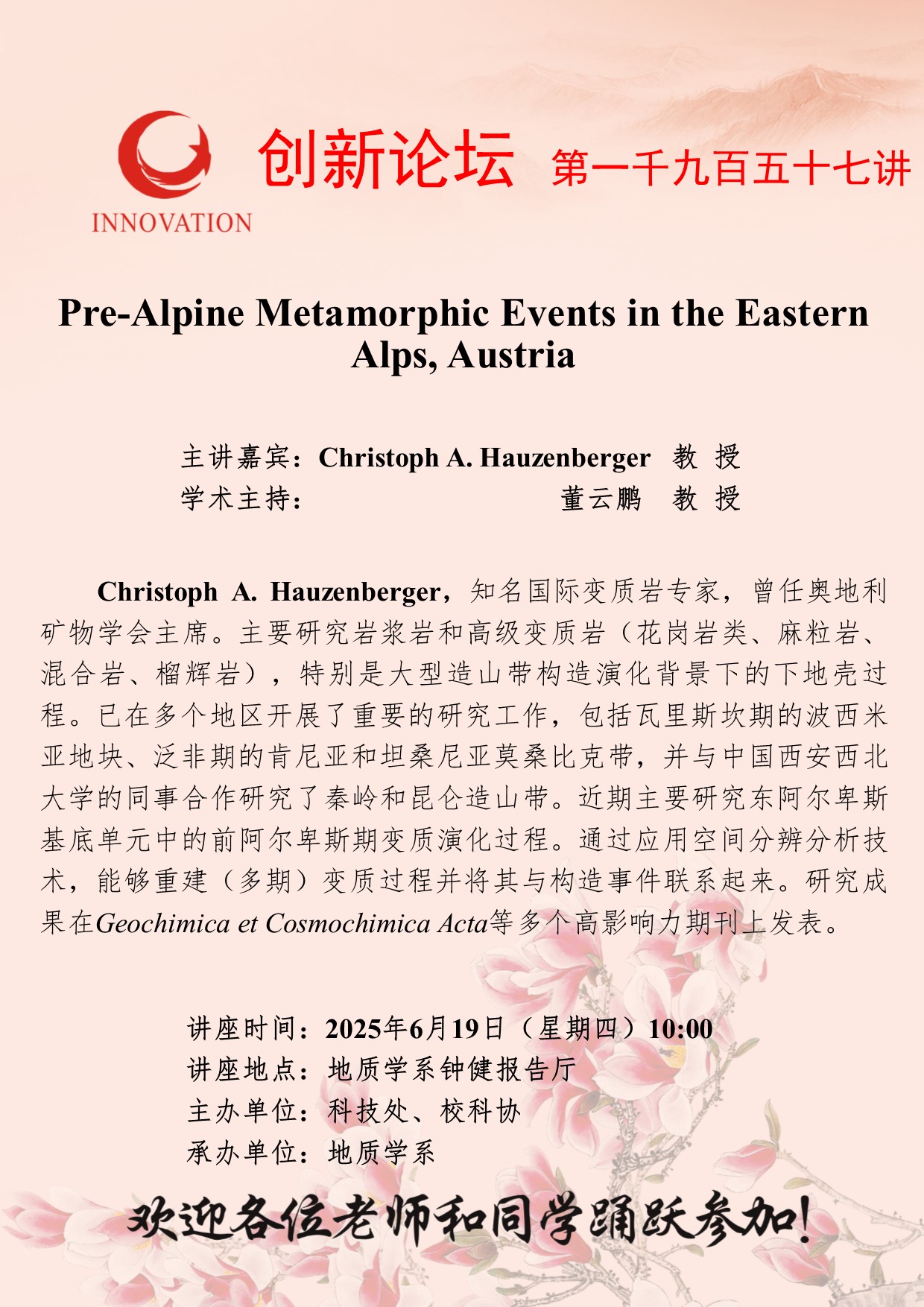 Christoph A. Hauzenberger 教授 8868体育登录创新论坛第一千九百五十七讲:Pre-Alpine Metamorphic Events in the Eastern Alps, Austria 讲座时间 2025年6月19日(星期四)10:00 讲座地点 地质学系钟健报告厅 讲座人介绍 Christoph A. Hauzenberger 教授 讲座内容
