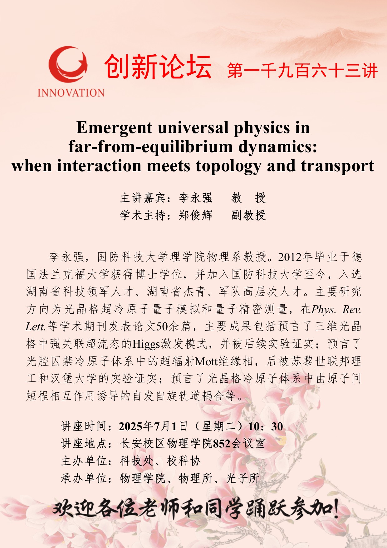 李永强 教授 8868体育登录创新论坛第一千九百六十三讲:Emergent universal physics in far-from-equilibrium dynamics: when interaction meets topology and transport 讲座时间 2025年7月1日(星期二)10:30 讲座地点 长安校区物理学院852会议室 讲座人介绍 李永强 教授 讲座内容