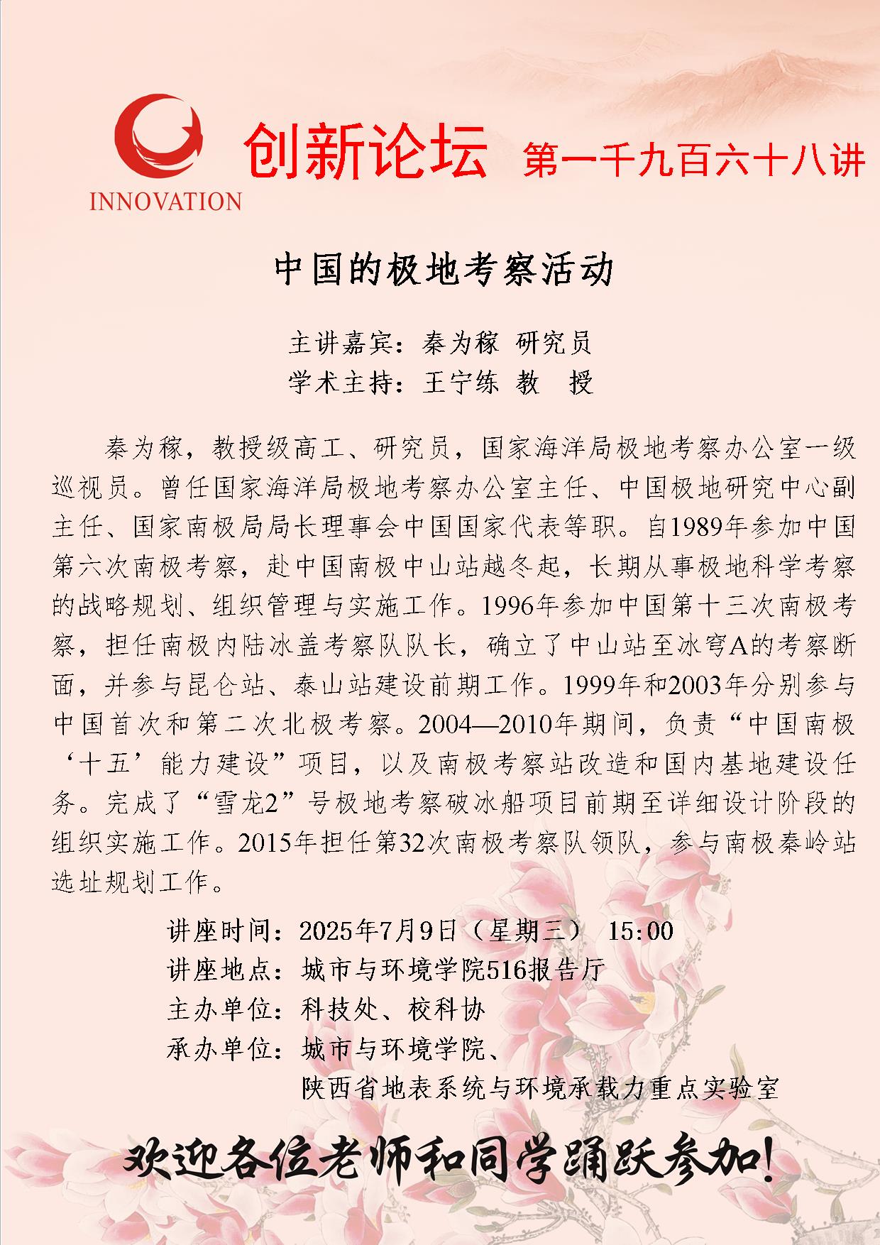 秦为稼 研究员 8868体育登录创新论坛第一千九百六十八讲:中国的极地考察活动 讲座时间 2025年7月9日(星期三) 15:00 讲座地点 城市与环境学院516报告厅 讲座人介绍 秦为稼 研究员 讲座内容