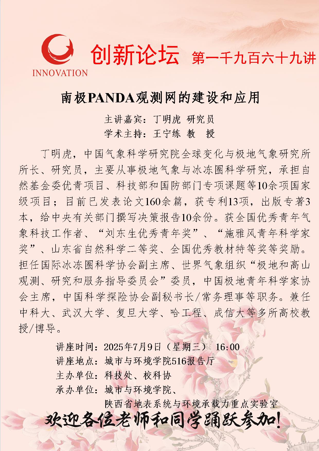 丁明虎 研究员 8868体育登录创新论坛第一千九百六十九讲:南极PANDA观测网的建设和应用 讲座时间 2025年7月9日(星期三) 16:00 讲座地点 城市与环境学院516报告厅 讲座人介绍 丁明虎 研究员 讲座内容