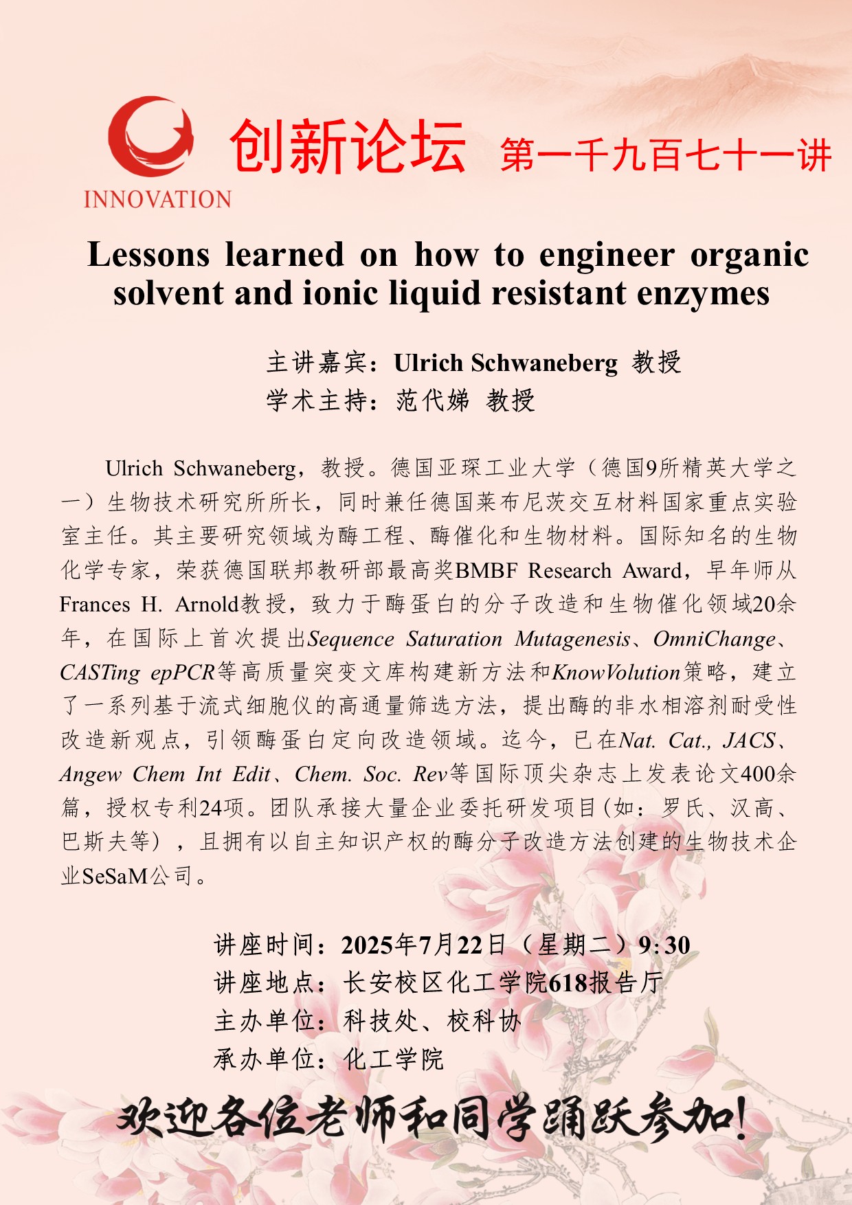 Ulrich Schwaneberg 教授 8868体育登录创新论坛第一千九百七十一讲:Lessons learned on how to engineer organic solvent and ionic liquid resistant enzymes 讲座时间 2025年7月22日(星期二)9:30 讲座地点 长安校区化工学院618报告厅 讲座人介绍 Ulrich Schwaneberg 教授 讲座内容
