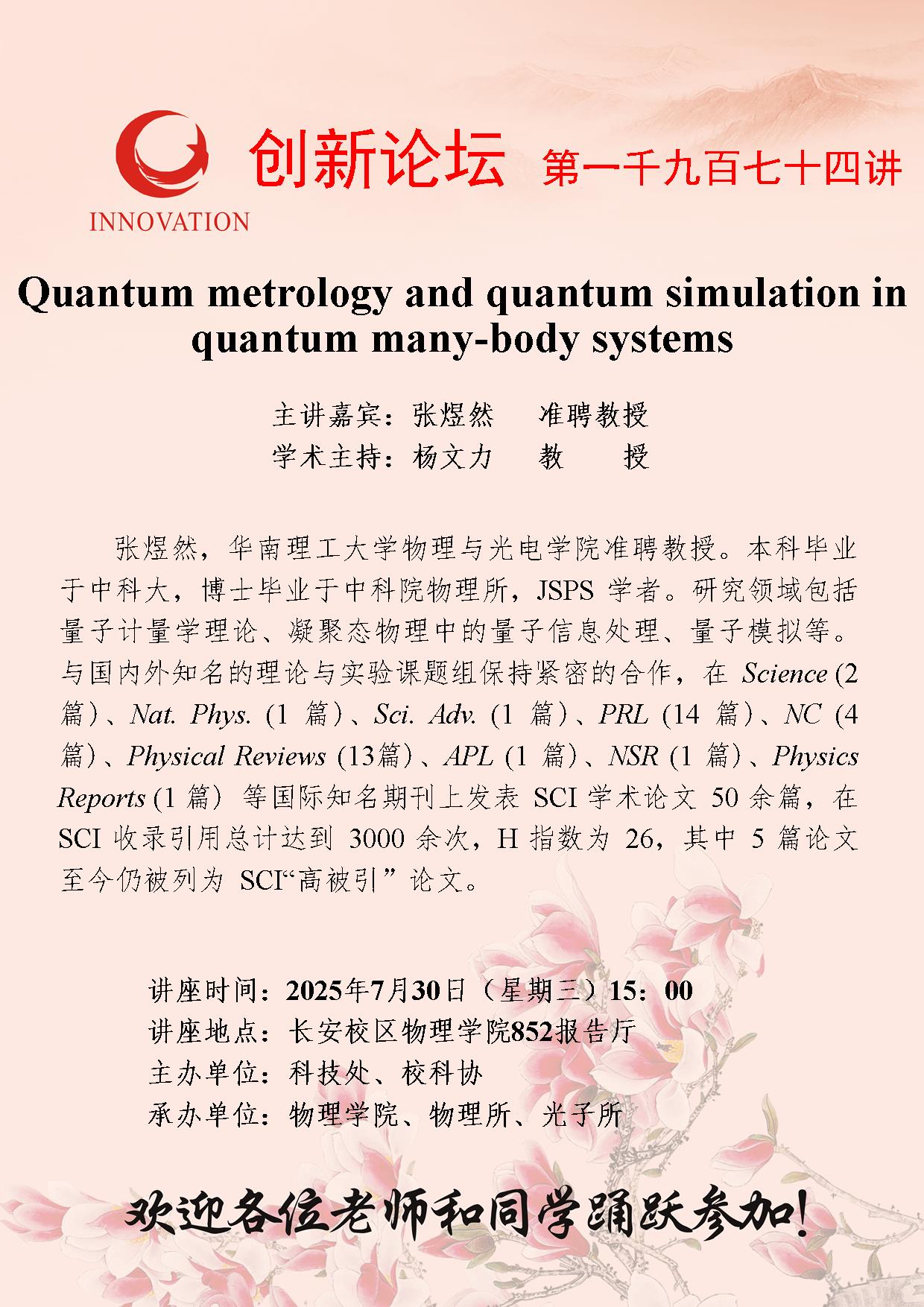 张煜然 准聘教授 8868体育登录创新论坛第一千九百七十四讲:Quantum metrology and quantum simulation in quantum many-body systems 讲座时间 2025年7月30日(星期三)15:00 讲座地点 长安校区物理学院852报告厅 讲座人介绍 张煜然 准聘教授 讲座内容