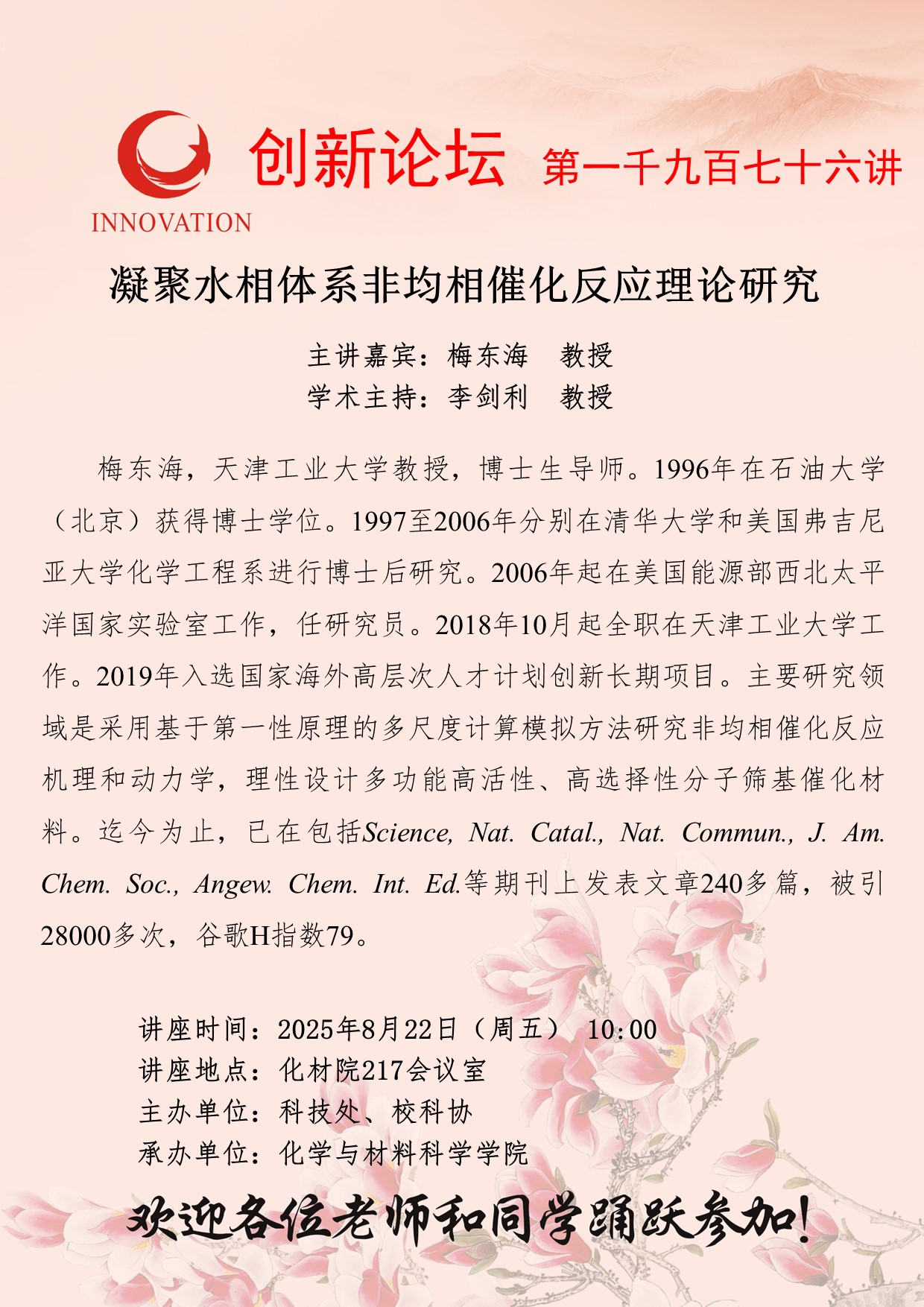 梅东海 教授 8868体育登录创新论坛第一千九百七十六讲:凝聚水相体系非均相催化反应理论研究 讲座时间 2025年8月22日(星期五) 10:00 讲座地点 化材学院217智慧教室 讲座人介绍 梅东海 教授 讲座内容
