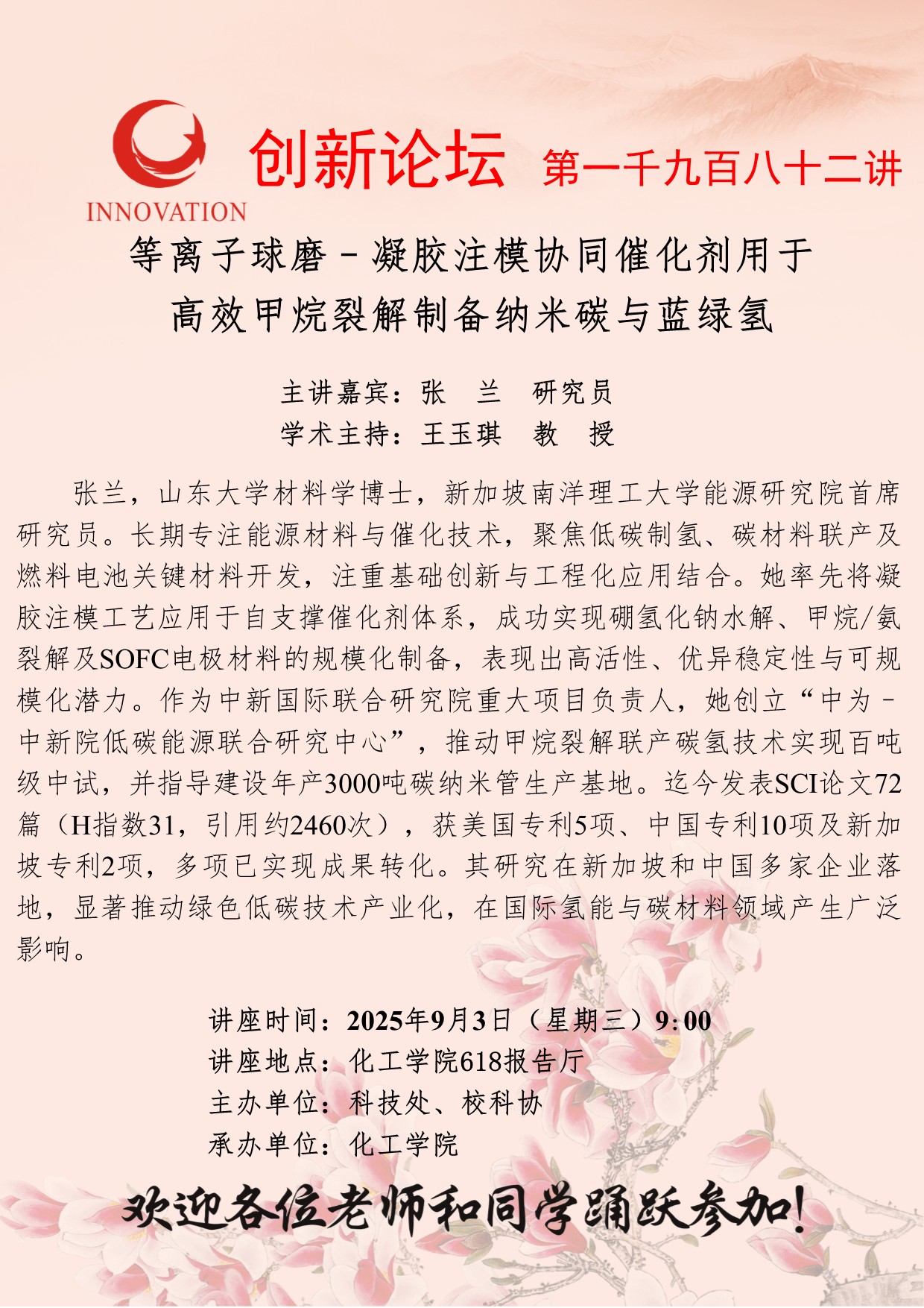 张兰 研究员 8868体育登录创新论坛第一千九百八十二讲:等离子球磨–凝胶注模协同催化剂用于高效甲烷裂解制备纳米碳与蓝绿氢 讲座时间 2025年9月3日(星期三)9:00 讲座地点 化工学院618报告厅 讲座人介绍 张兰 研究员 讲座内容