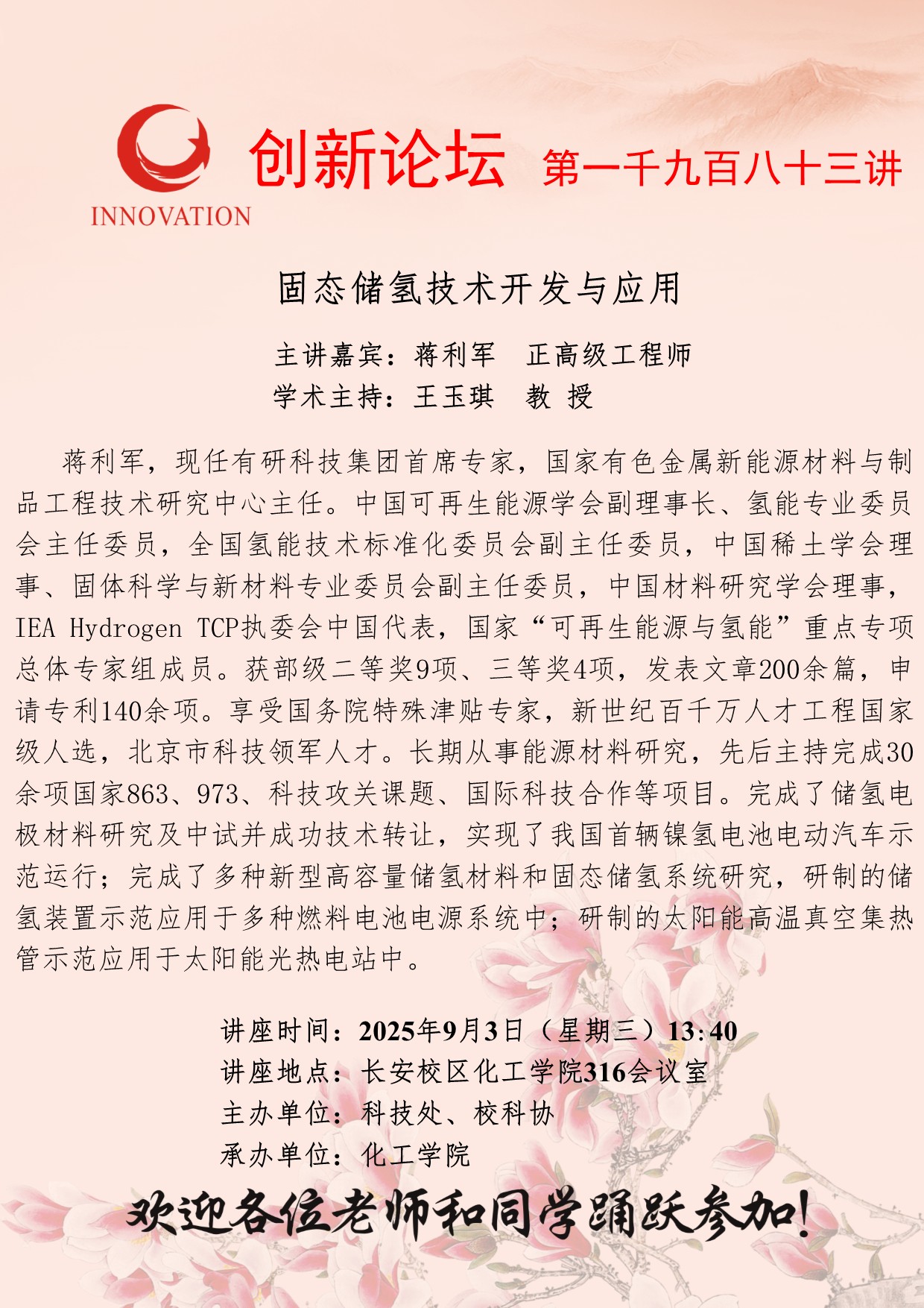 蒋利军 正高级工程师 8868体育登录创新论坛第一千九百八十三讲:固态储氢技术开发与应用 讲座时间 2025年9月3日(星期三)13:40 讲座地点 长安校区化工学院316会议室 讲座人介绍 蒋利军 正高级工程师 讲座内容
