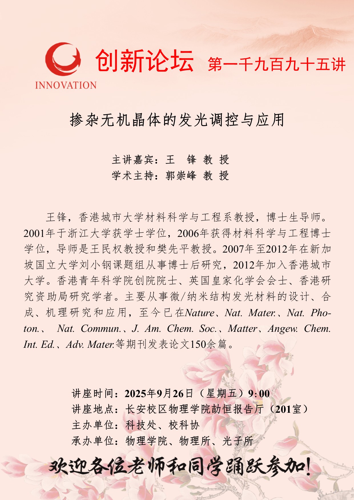 王锋 教授 8868体育登录创新论坛第一千九百九十五讲:掺杂无机晶体的发光调控与应用 讲座时间 2025年9月26日(星期五)9:00 讲座地点 长安校区物理学院劼恒报告厅(201室) 讲座人介绍 王锋 教授 讲座内容