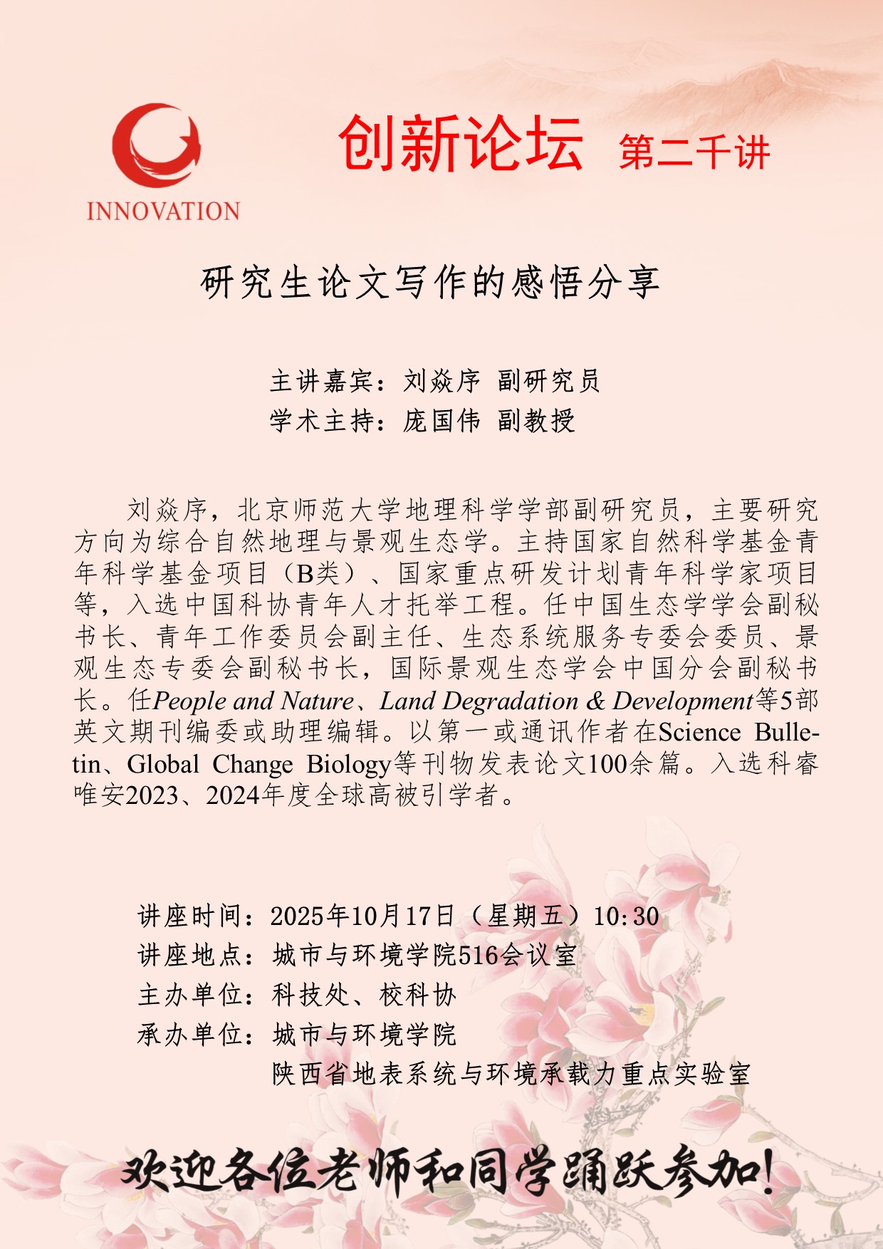 刘焱序 副研究员 8868体育登录创新论坛第二千讲:研究生论文写作的感悟分享 讲座时间 2025年10月17日(星期五)10:30 讲座地点 城市与环境学院516会议室 讲座人介绍 刘焱序 副研究员 讲座内容